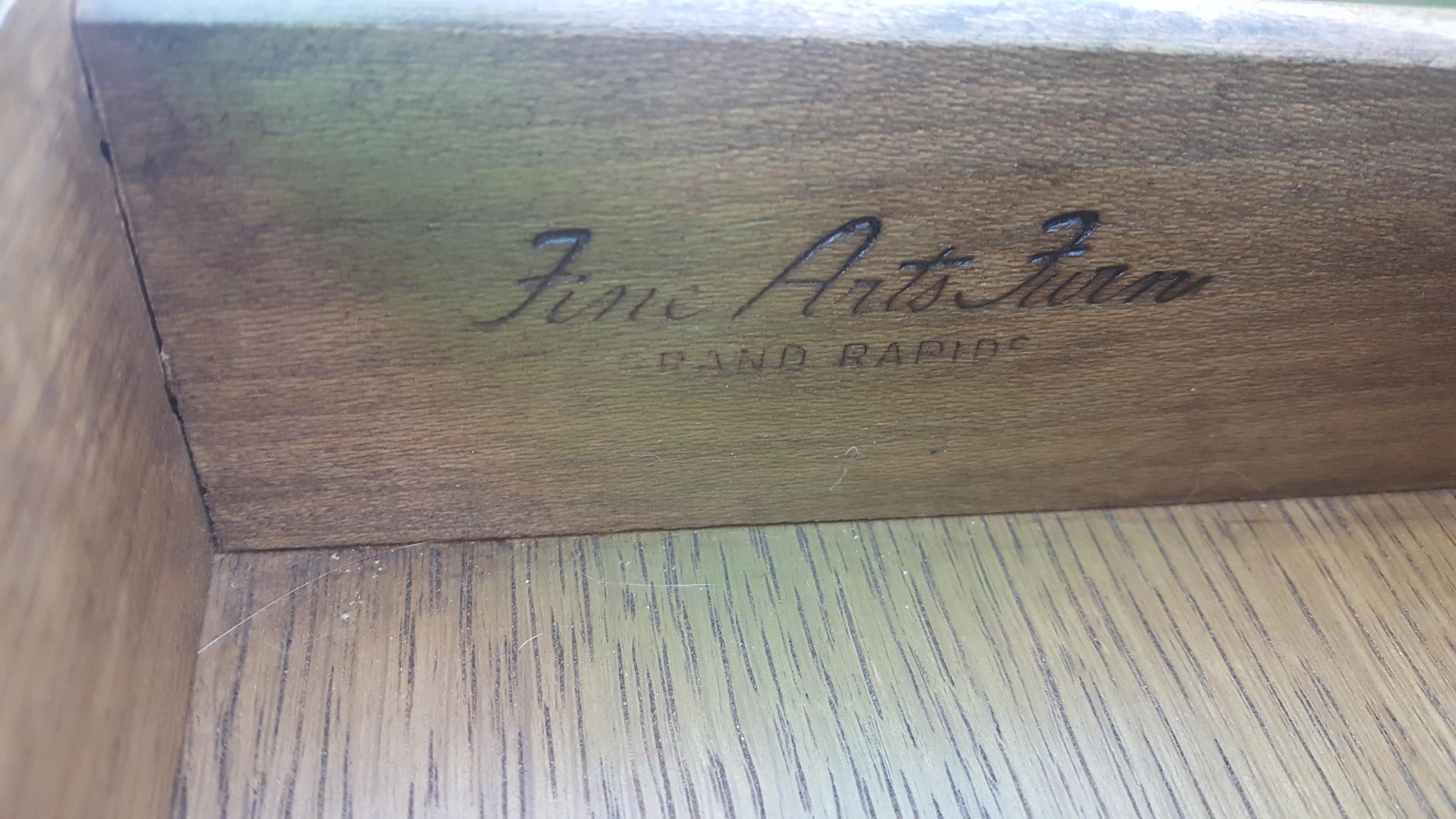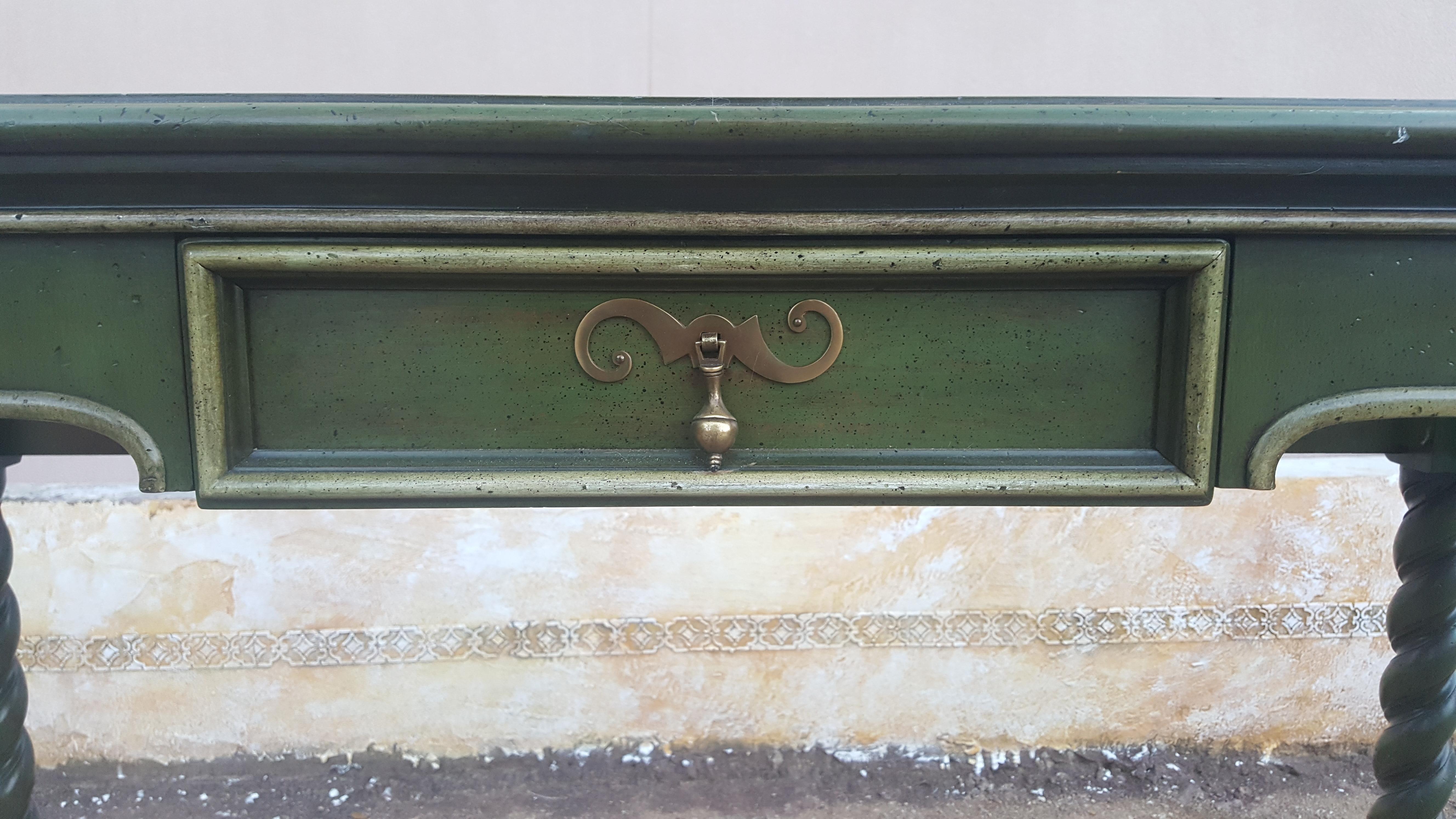 Green (Verde) with White trim entry table. "Brass pull on drawer. "Fine Arts Furn, Grand Rapids" mark on inside of drawer.