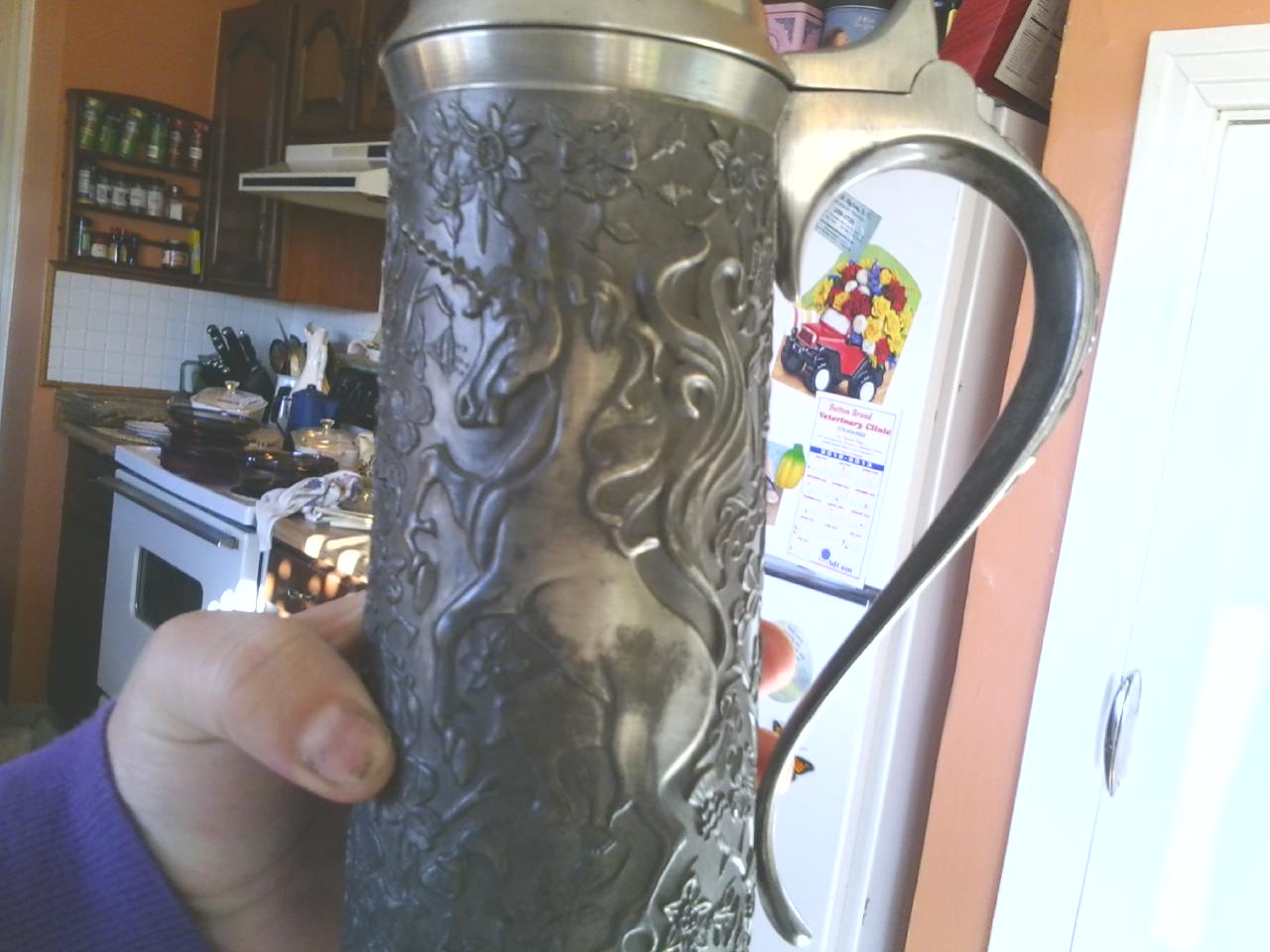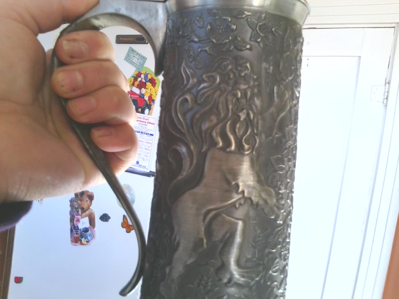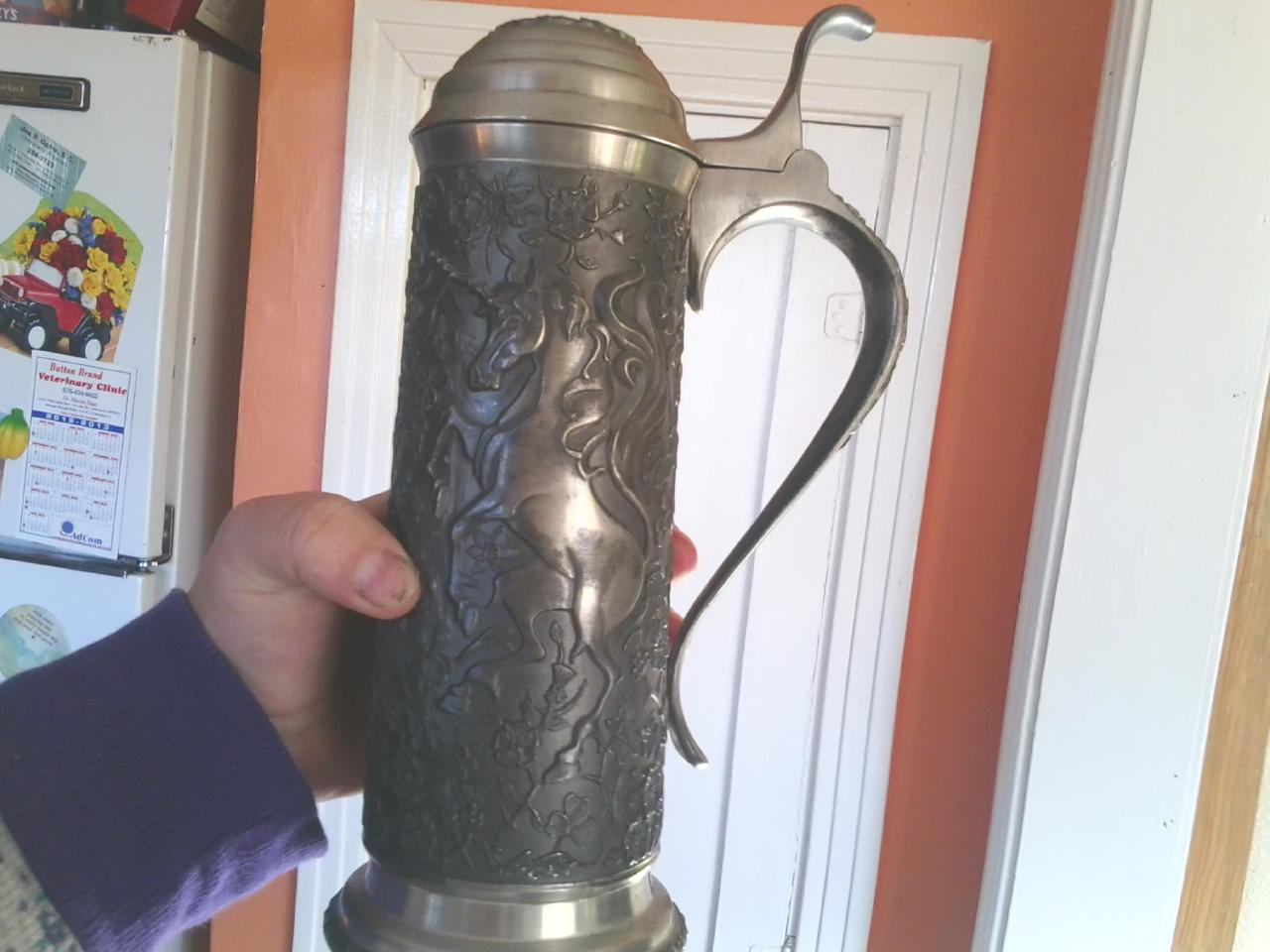 franklin mint ltd find pewter 1979, tankard, embossed with lion and unicorn 9.5 inches tall, top 3 inches in diameter, base, four inches