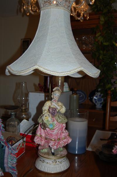 Porcelain fiqurine lamp of woman with floral basket. Bodice lace cinch top of dress with long poofy gown. Black shoes with heel and buckle. Hair worn up in fan shape with side braid coming down in front. Pastel shades of coloring throughout with pinks, cremes, green. Some yellow, blue, and gold hilights.