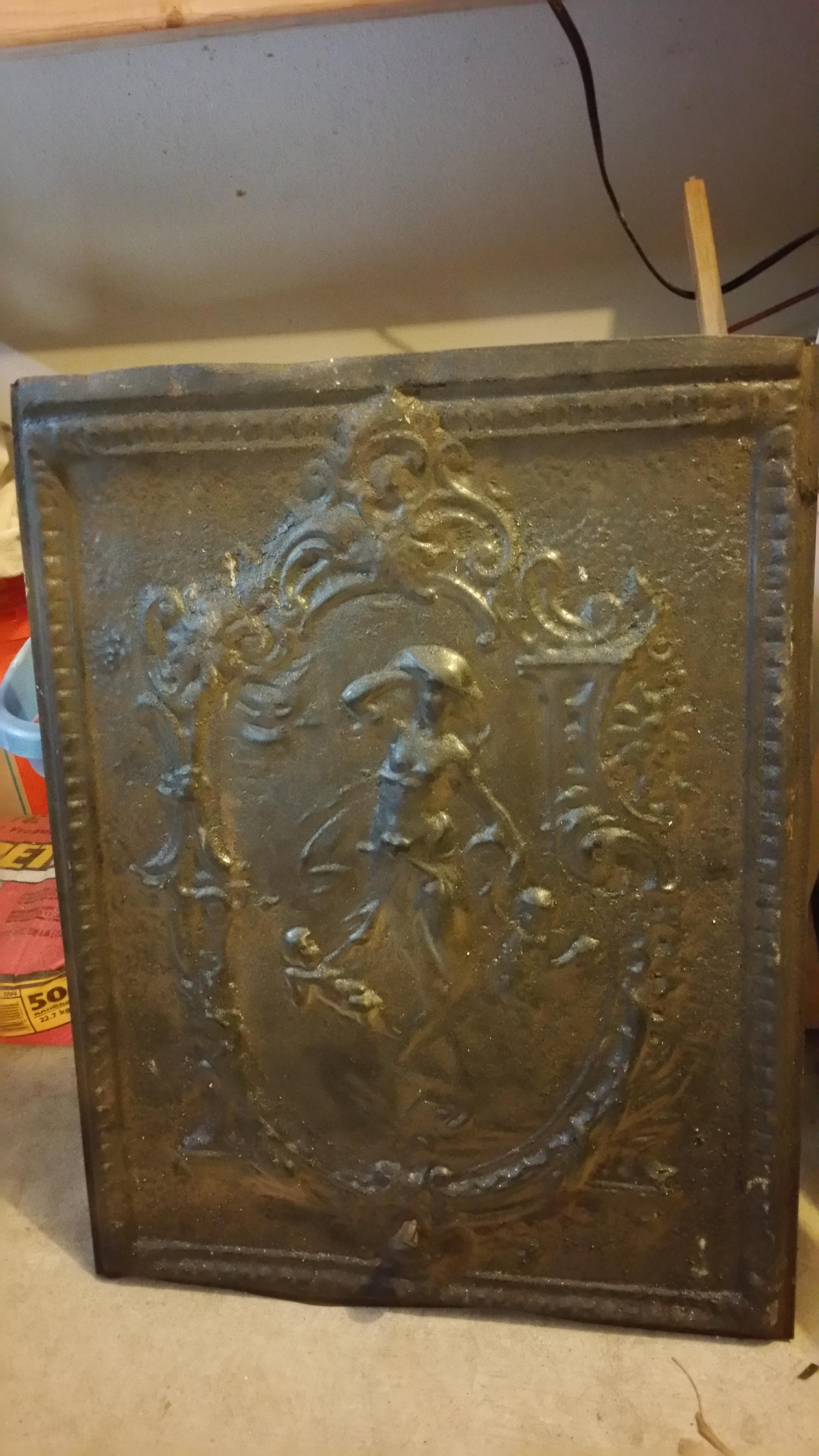 it's definitely a metal of some sort, has a lady on the front with two cherubs near her feet. It also has a pretty piece that goes around it. Sorry about the ladder behind it, it's awkward and won't stay up on it's own. My husband came across this remodeling a flip house. It came off of the fire place. I don't know how old it is. But is was a pretty old house. P.s. I don't know how to flip the pictures. Sorry