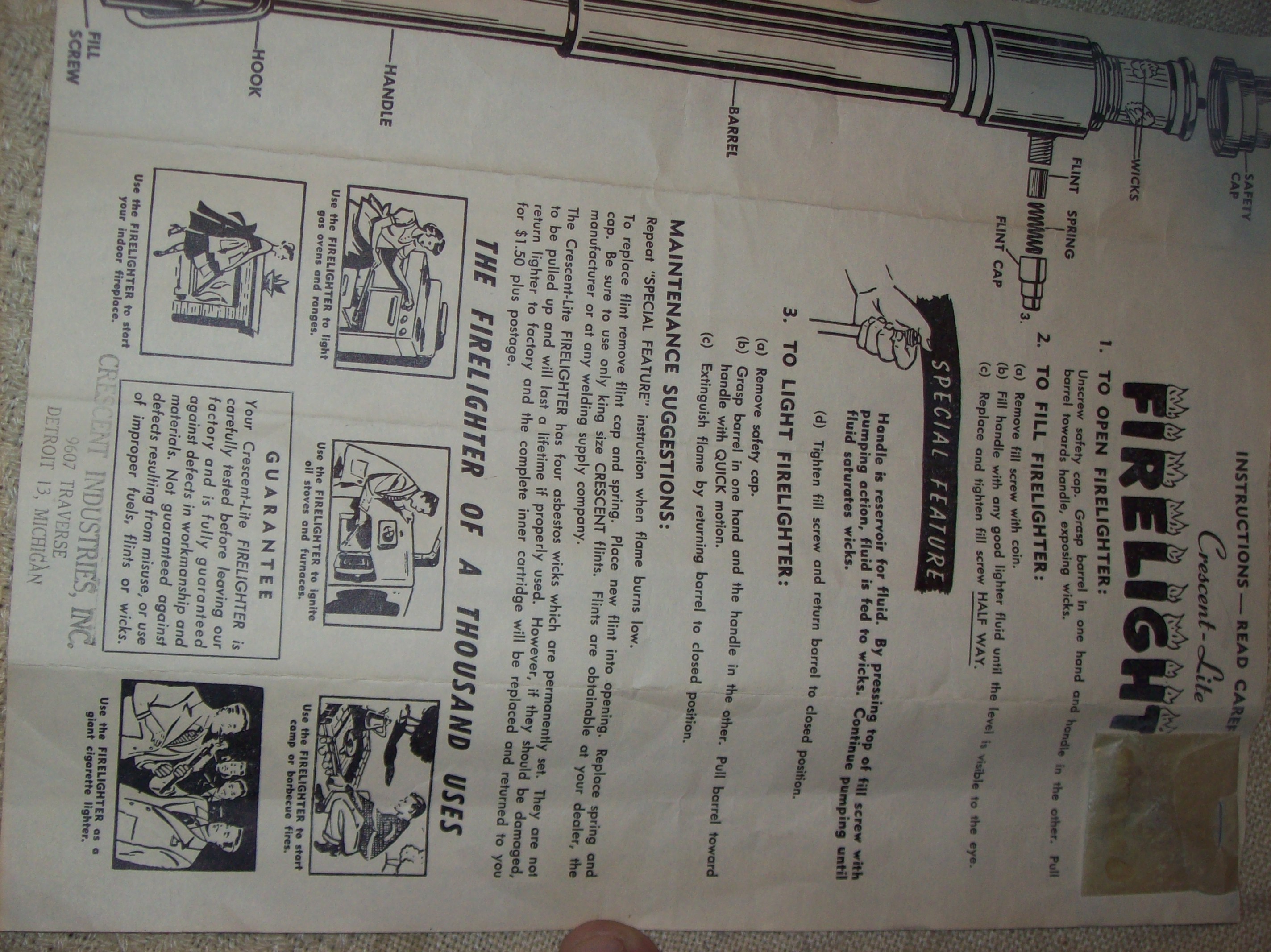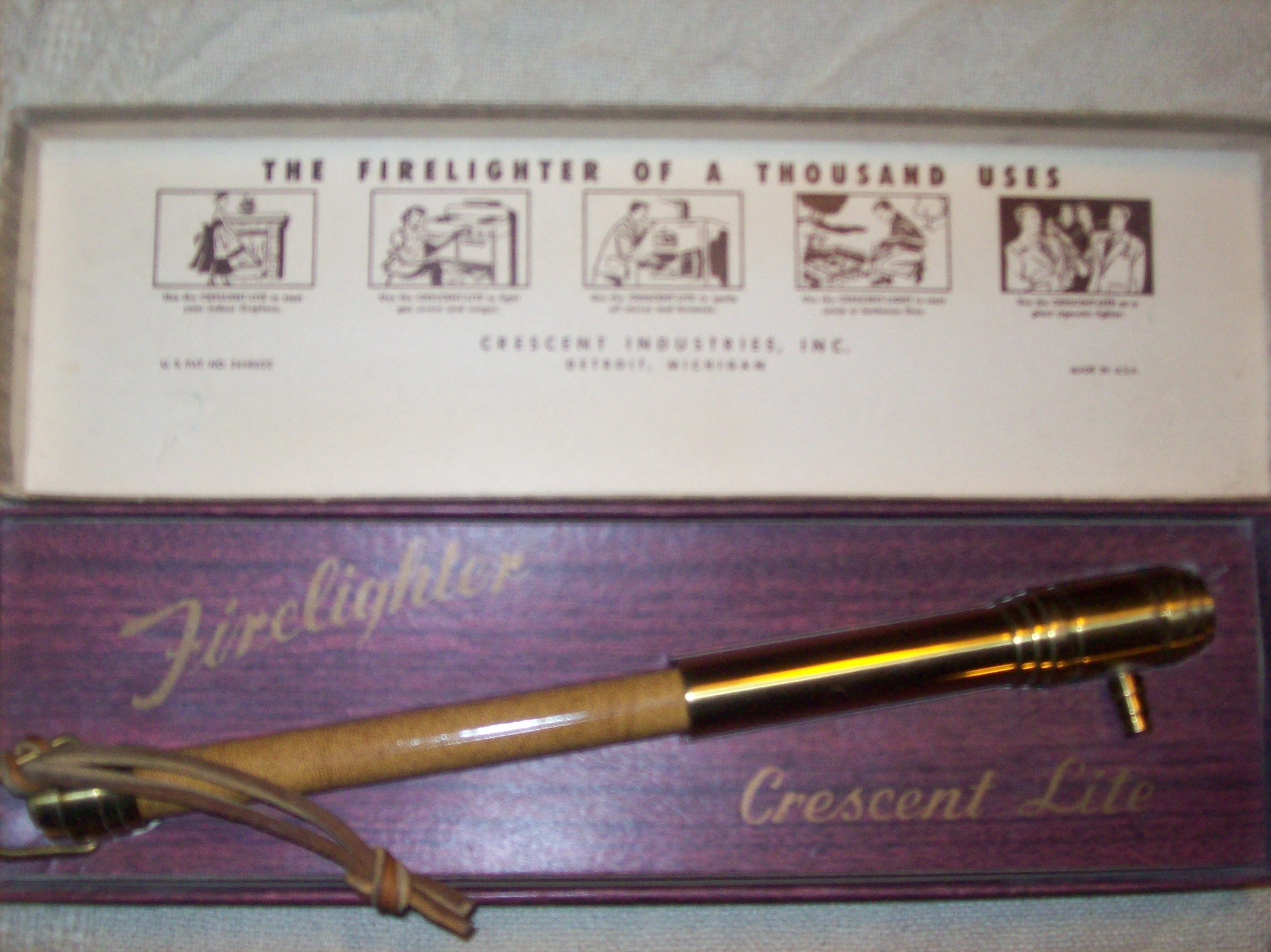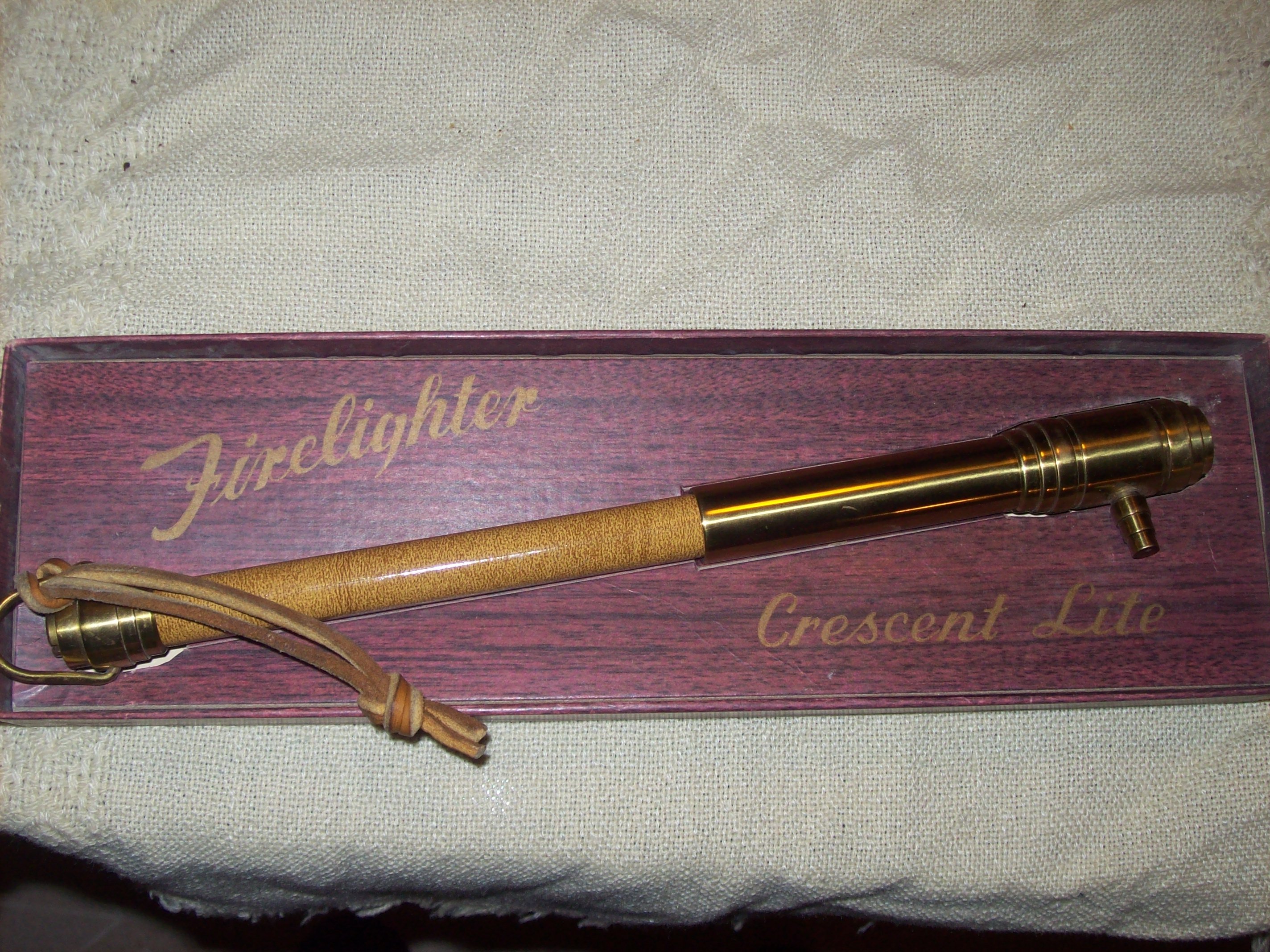 the stamp on the barrel says crescent light pat, you put the fluid in the tube by removing the screw on one end the other end has a nipple for the flint and the wick, you pump the handle and the rough grooves under the flint spark the wick. in original box with instructions.