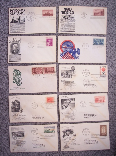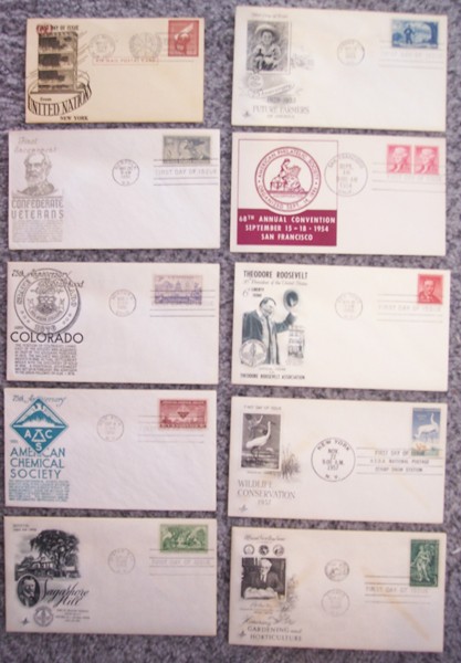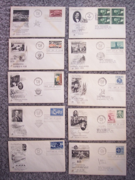 1950's: Balloon "Jupiter"; UN World Refugee Year; Hawaii Statehood; Soil Conservation; Oil's First Century; Third Pan Am Games; Dental Health; 2.5 cent Coil Stamp; Ernst Reuter (4 & 8 cent versions); Guisseppe Garibaldi; UN Day; UN Economic Commission; UN General Assembly; United Nations (non-specific); Confederate Veterans; Colorado Statehood; American Chemical Society; Sagamore Hill; Future Farmers of America; American Philatelic Society; Theodore Roosevelt; Wildlife Conservation; Gardening and Horticulture; Brussels International Exhibition; International Geophysical Year; Forest Conservation; Fort Duquesne; Alaska Statehood; Lincoln Sesquicentennial; Oregon Statehood; Jose de San Martin; Lincoln Cooper Union Speech; NATO; Hermitage; Arctic Explorations; International Chamber of Commerce; Benjamin Harrison; Comstock Lode; Bunker Hill; St. Lawrence Seaway; 49 Star American Flag