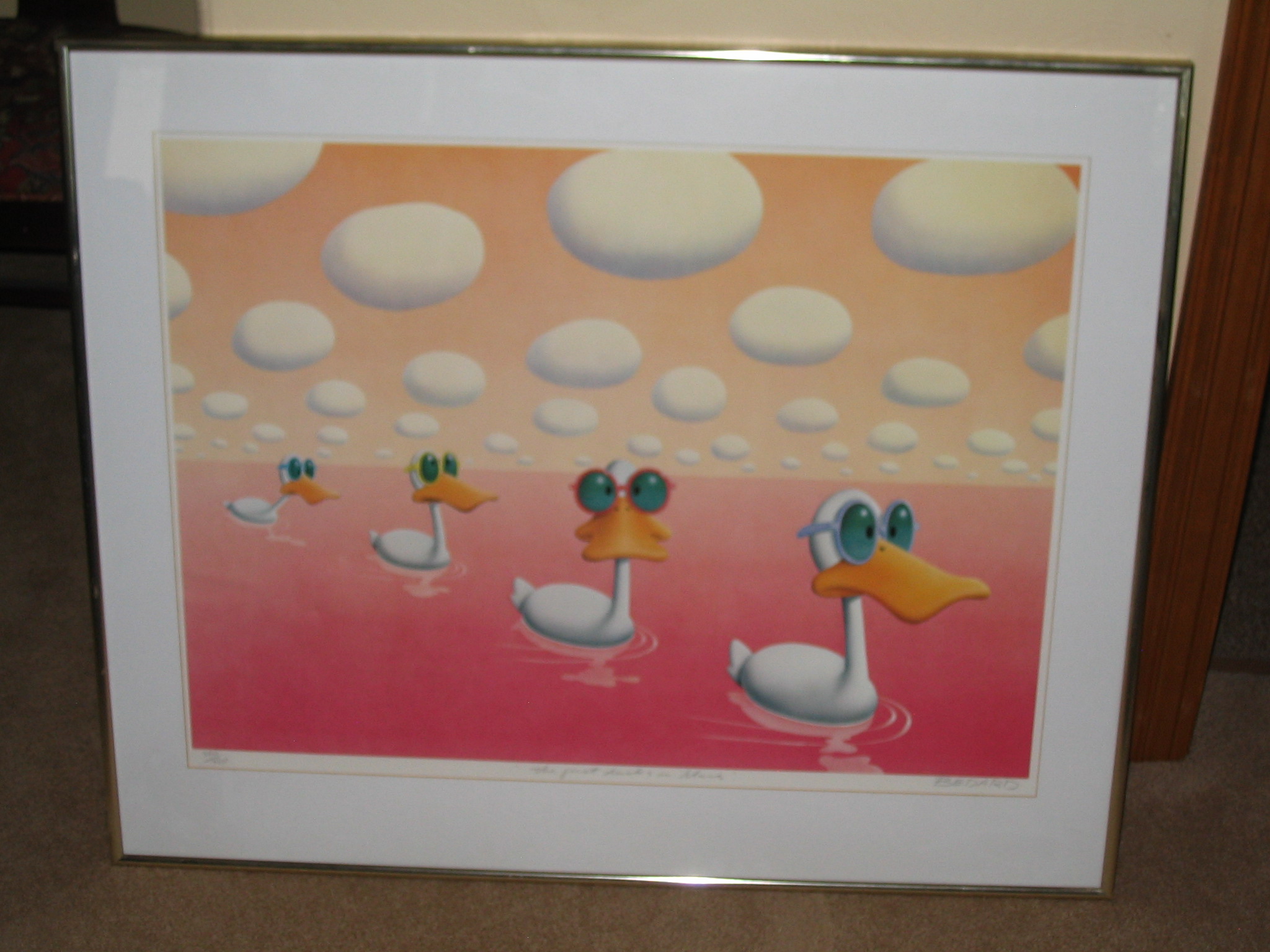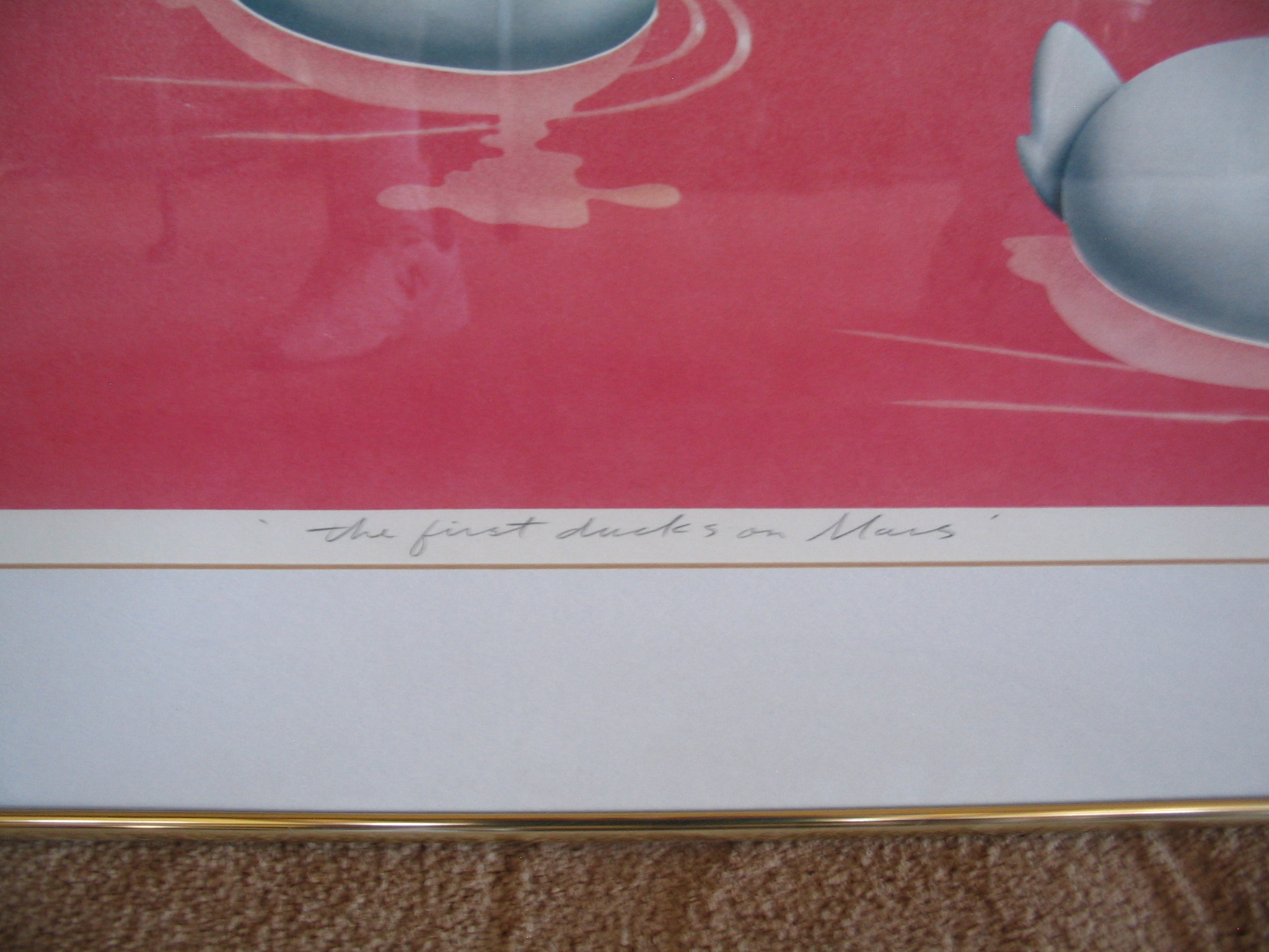 Limited Edition colored lithograph #390/450 of "the first ducks on Mars" by Michael Bedard. Framed size is 30.5" x 36.75". MINT condition. Framed under glass.
