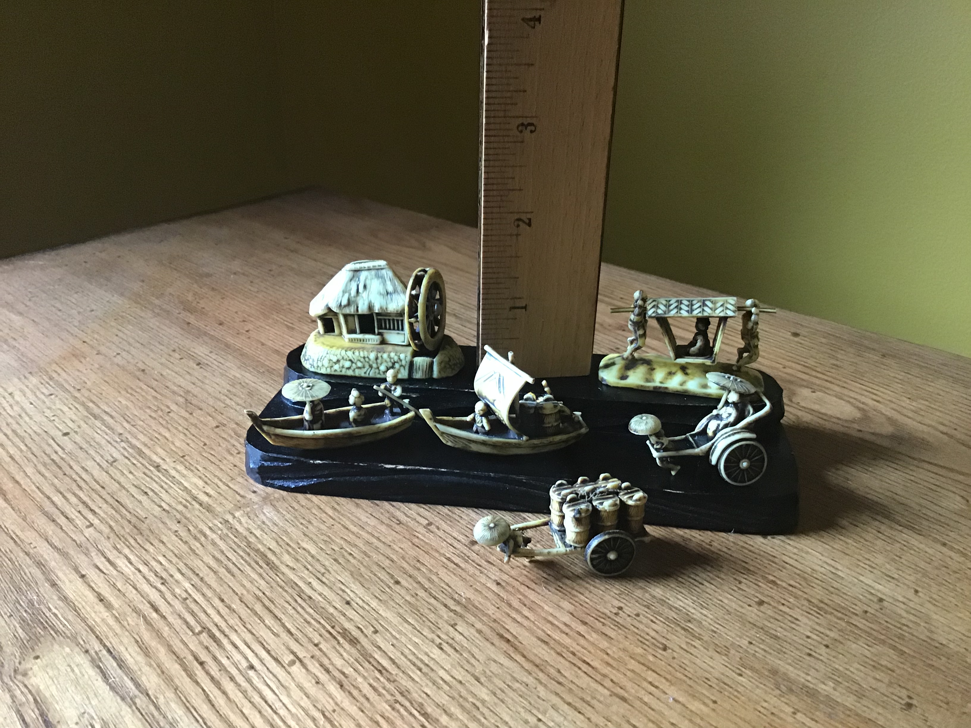 There are 6 miniature carvings from Japan carved from fish bone. The detail is amazing. The water wheel turns. They are at least 60+ years old.