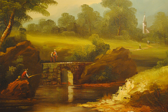 Image of a fisherman beneath a bridge. 2 people walking across the bridge, and a church off to the right of the painting.