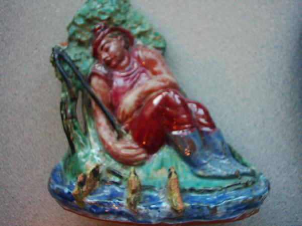 a figure made out of clay or terracotta material with a glazed finish depicting a fisherman or poacher figure who is asleep at the riverbank with three fishes at the waters edge which seem to be taunting him.