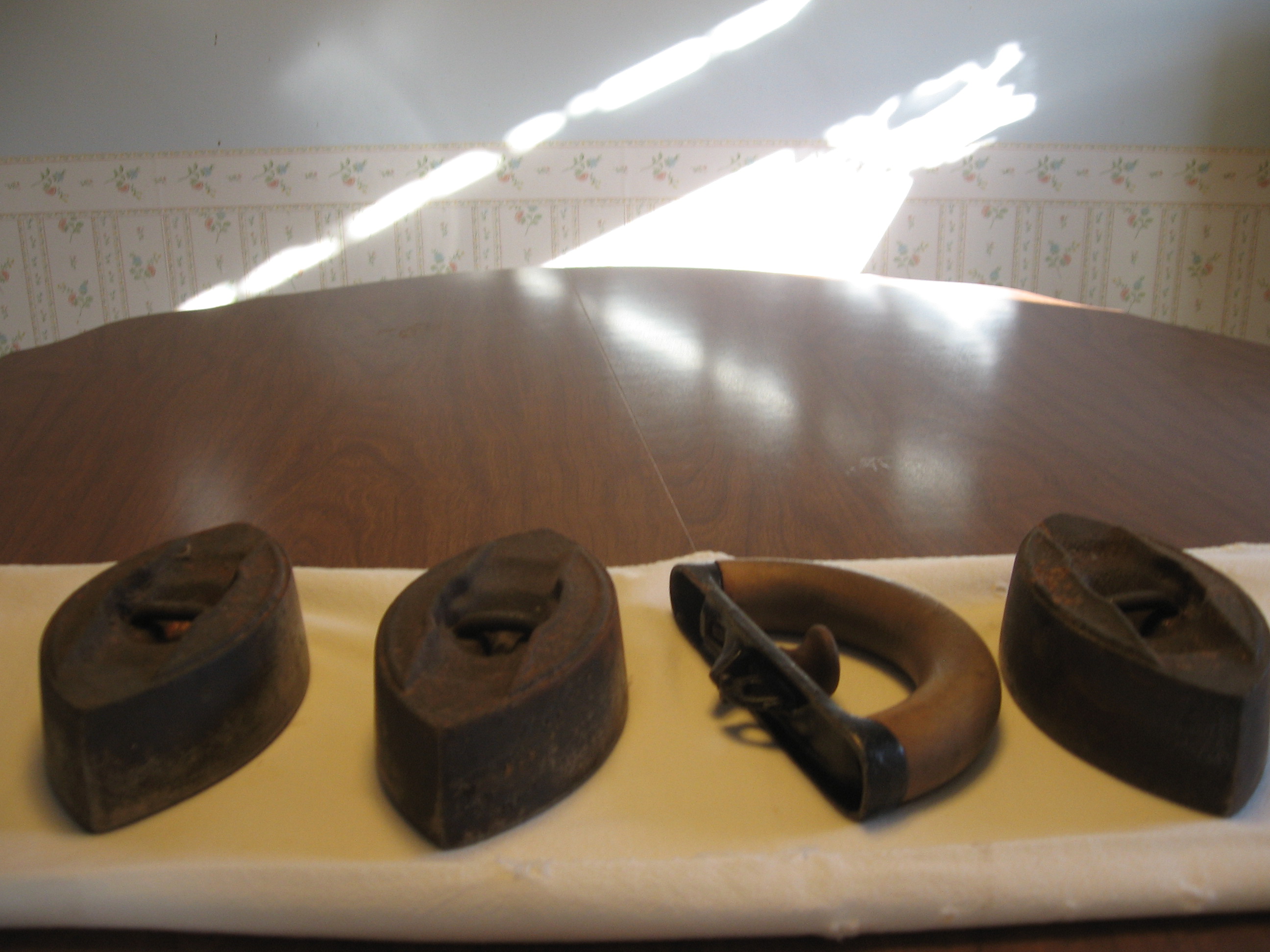 These irons came from a 1930s farm home in southern MN where the landlord would not pay for a power pole to connect the house to the REA's line along the highway. These irons could be heated on the wood stove for use. Found in a box in the attic of a 90 year old whose family lived in the same area for nearly 150 years.