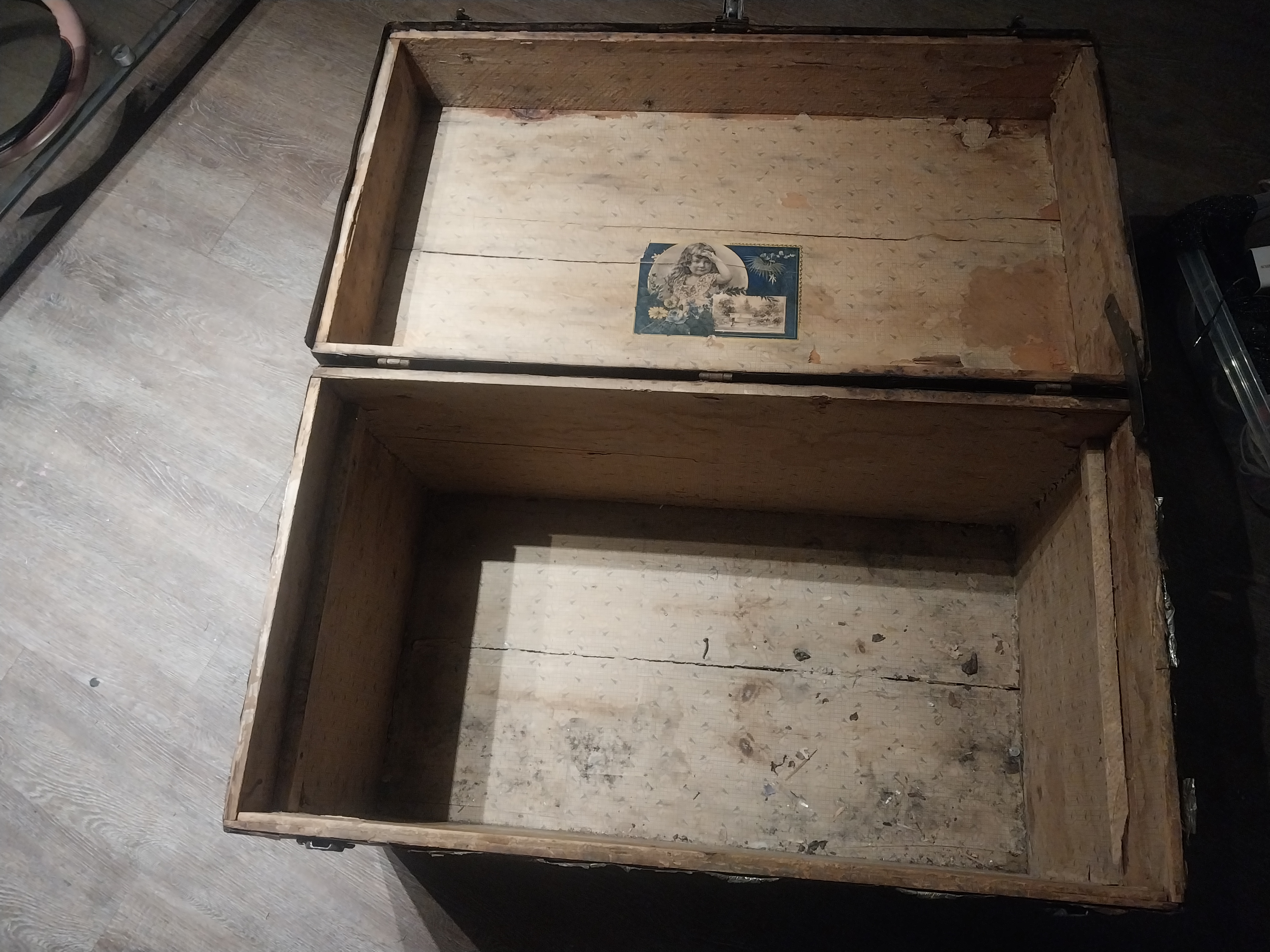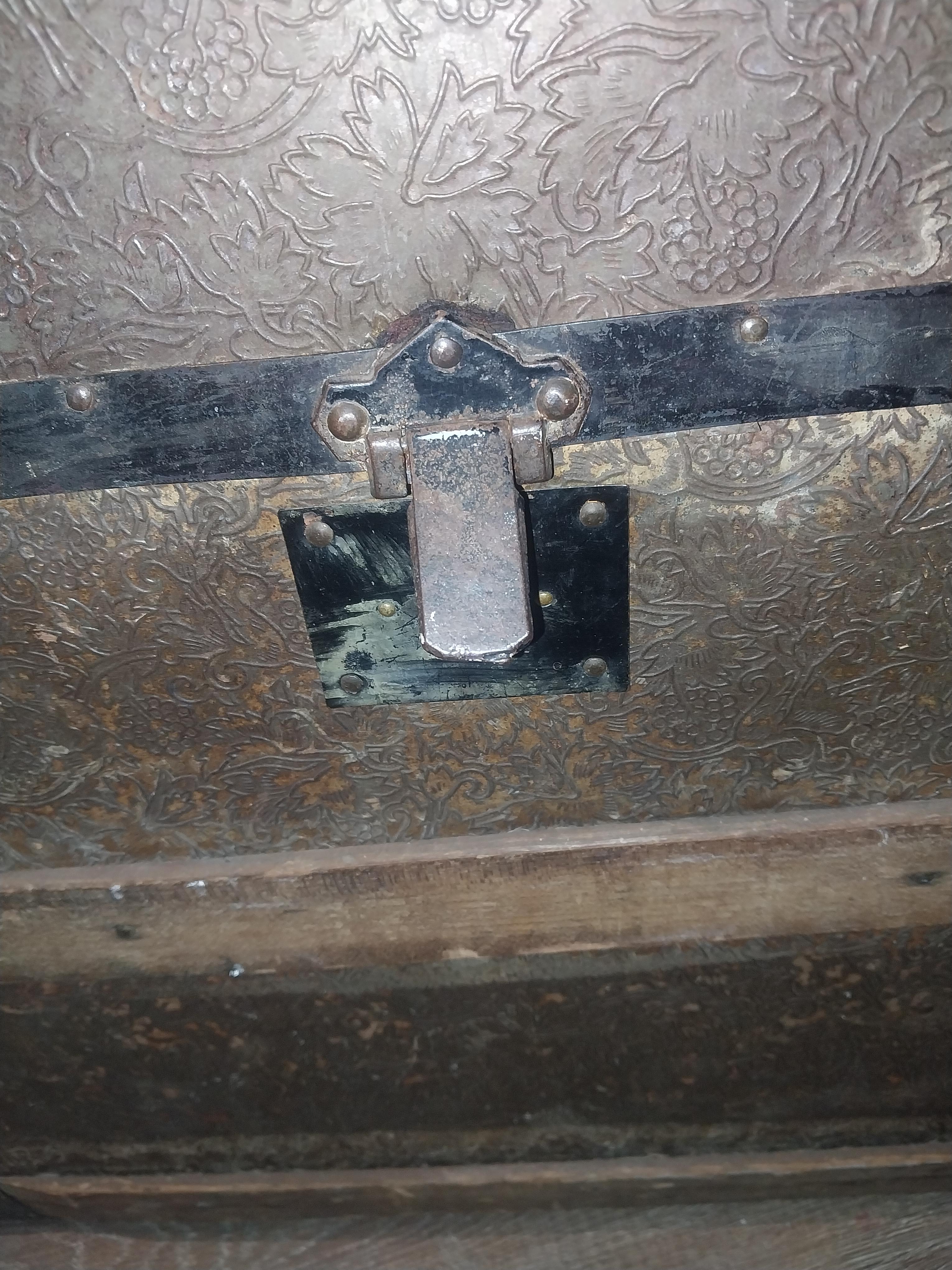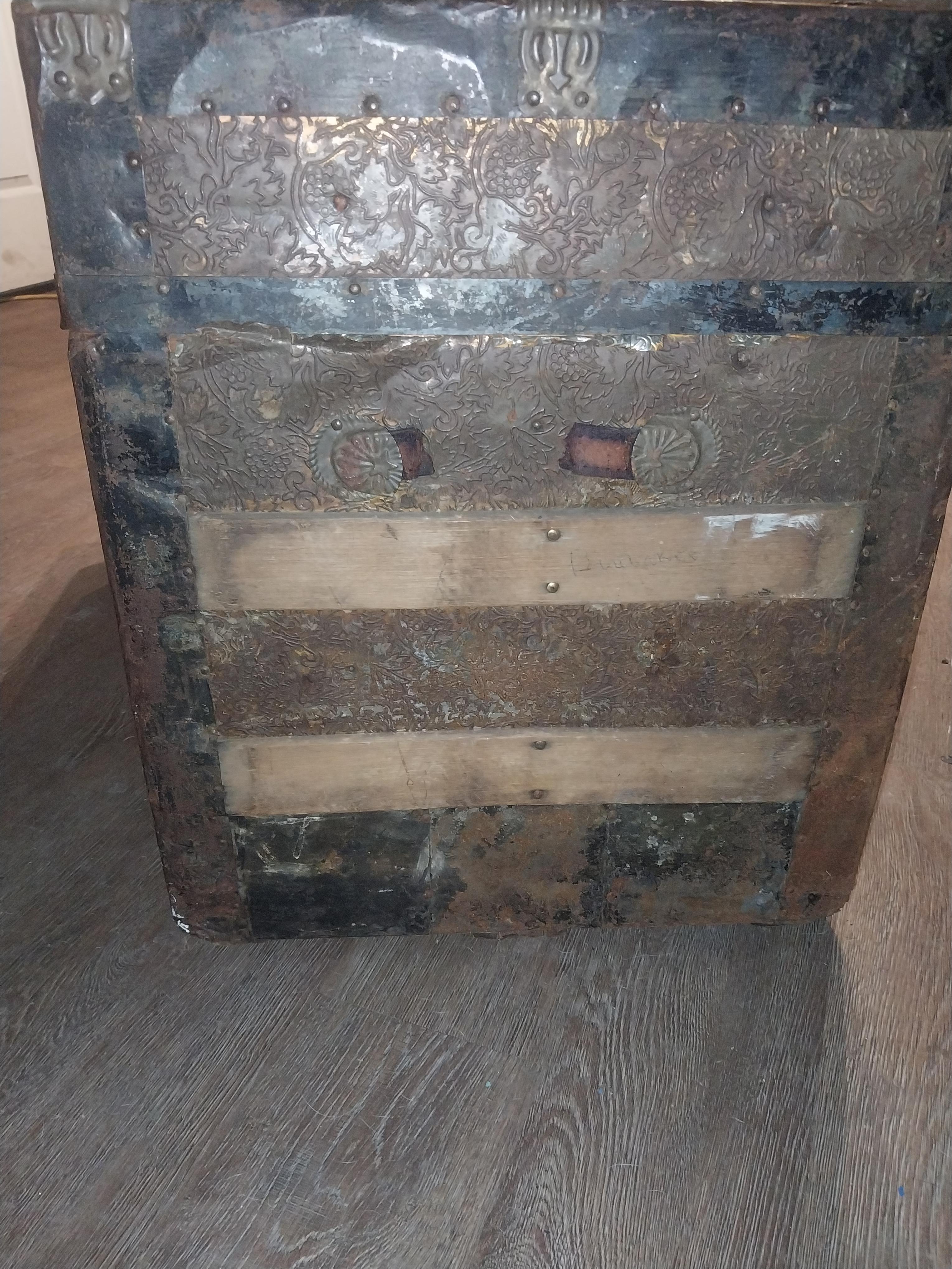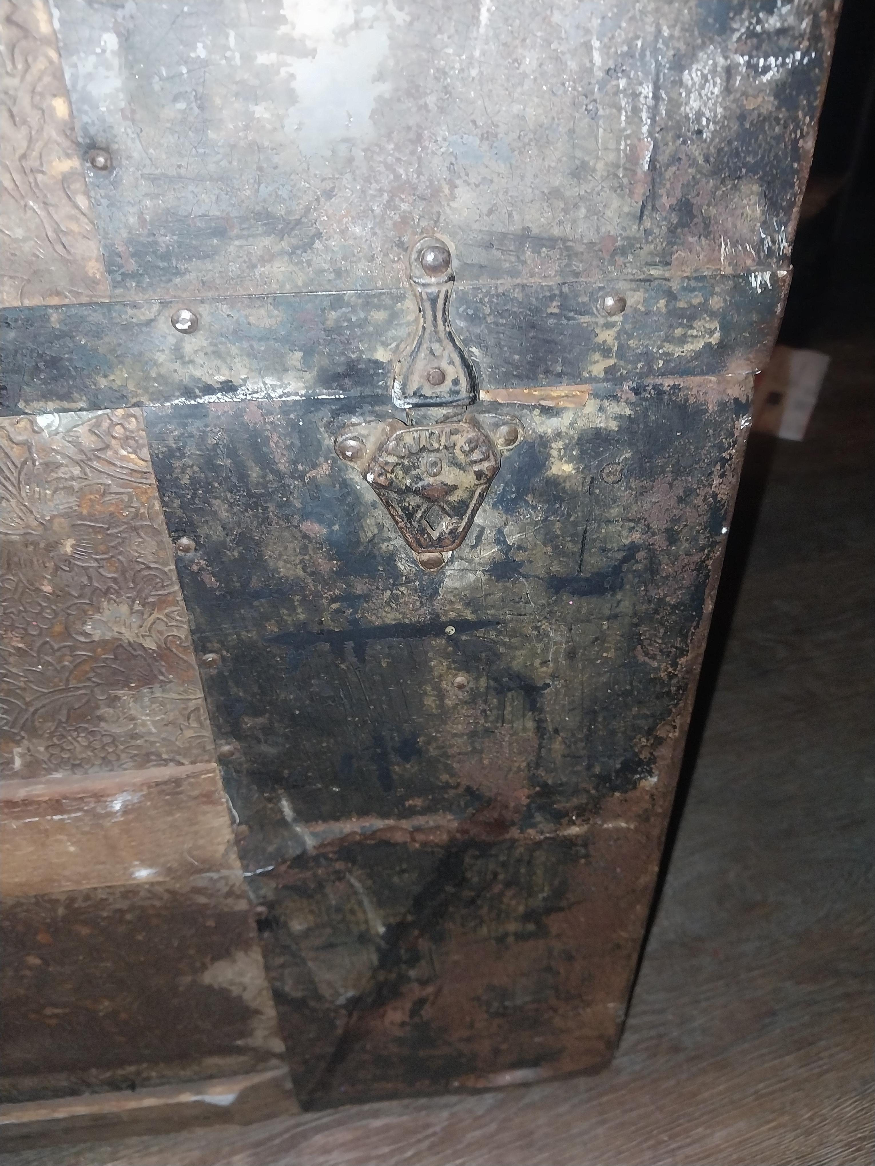 I found this trunk... it shows its age for sure. The locks say PAT JUL 972 and the Hardware on top says PAT MAR 188 I believe. There is a picture on the inside of the lid (mostly blue) of a picture of a little girl and flowers, looks as if she saluting another picture. Also is looks as if there's a shelf missing from inside. The side handles are not complete, both locks (not middle) DO work. There's all 4 wheels in tact underneath.
