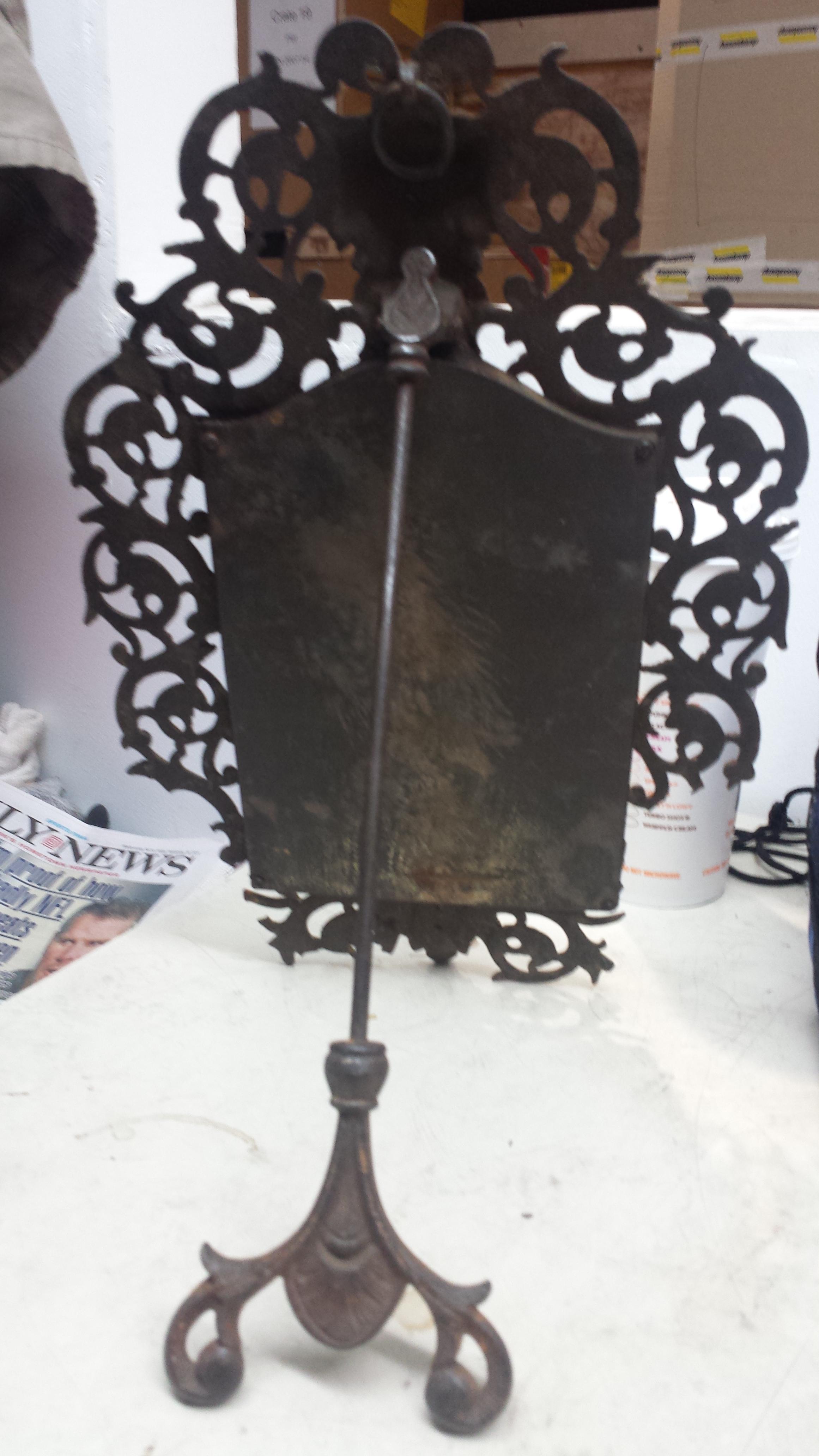 It is a beautiful old mirror but I would think that the missing piece prevents it from having any sort of value. It is similar to a Victorian mirror I used to own. The stand is very elaborate - more so then the one I owned and the face adds an intersting touch.