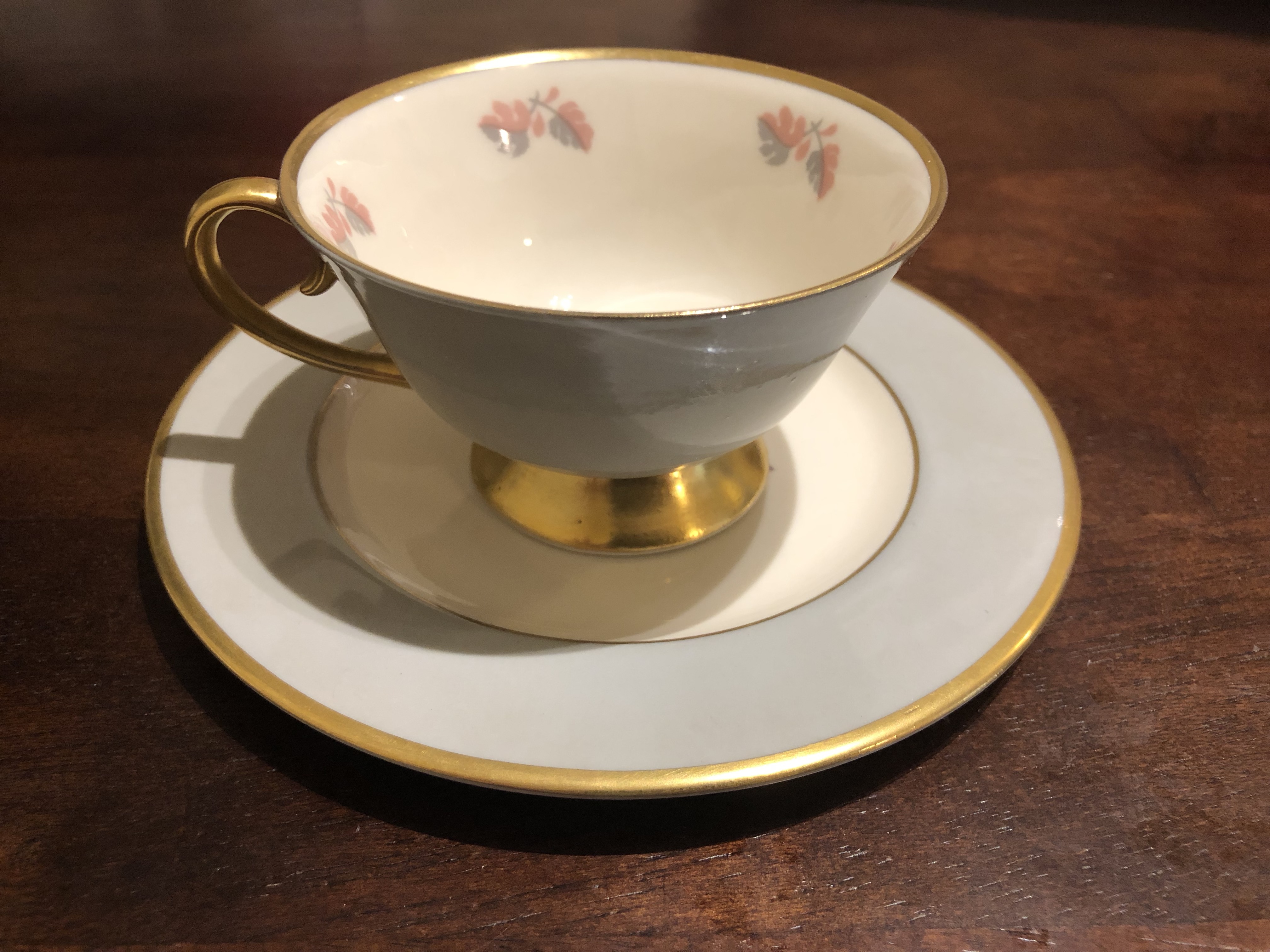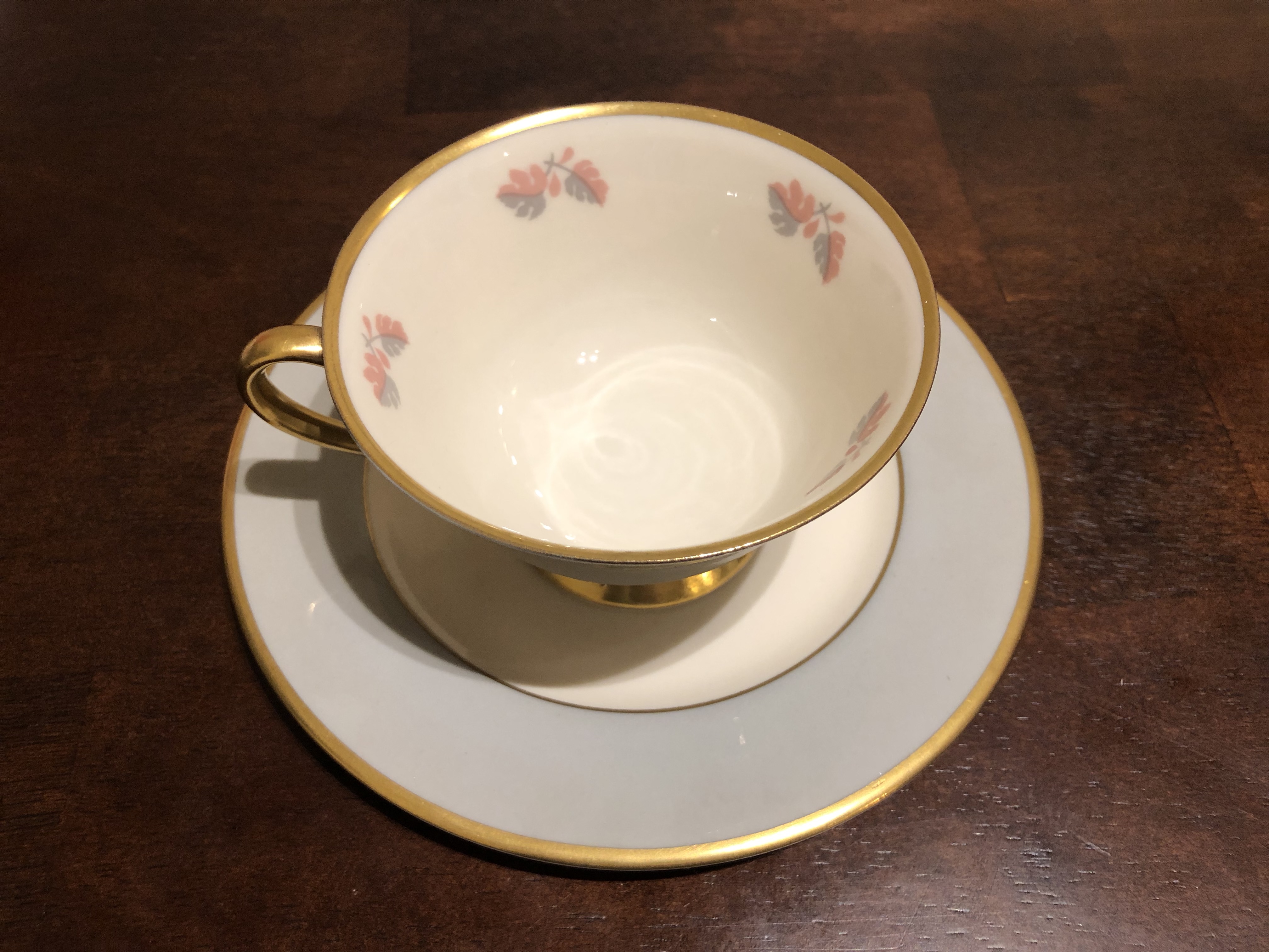 I found a set of five teacups and five saucers alongside a creamer in Spokane, WA. They're all in great conditition, with gold lining and stamped with Flintridge China logo. They have a blue/gray and pink leaf pattern that is called Twilight Gold, except for the creamer which has no pattern on it.