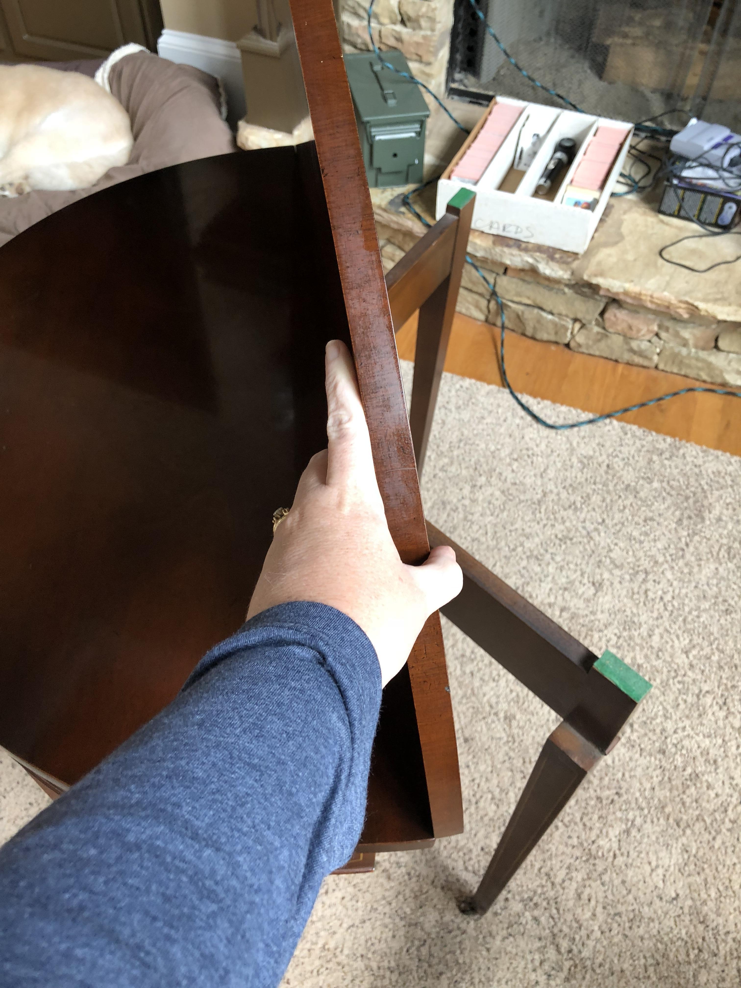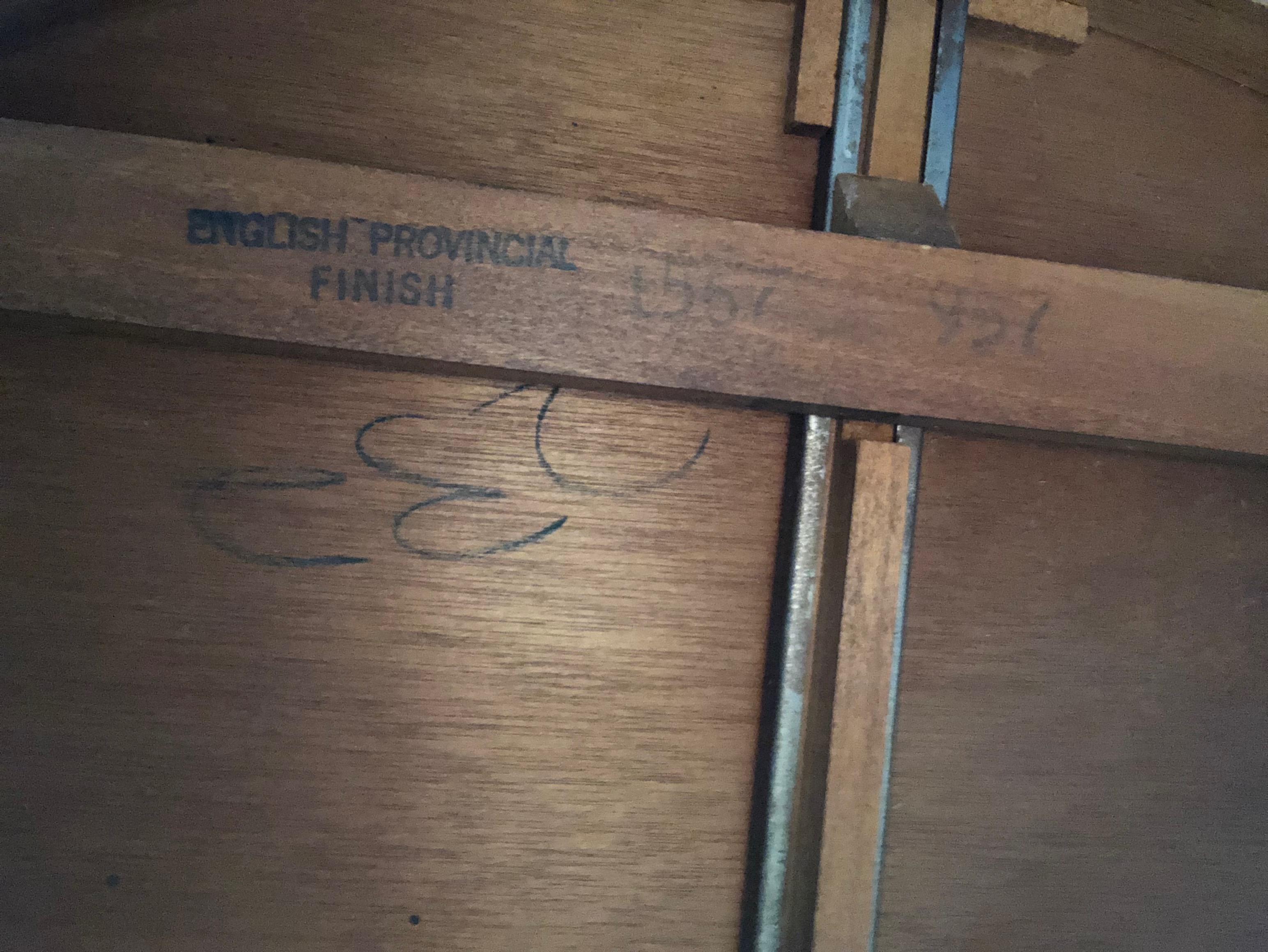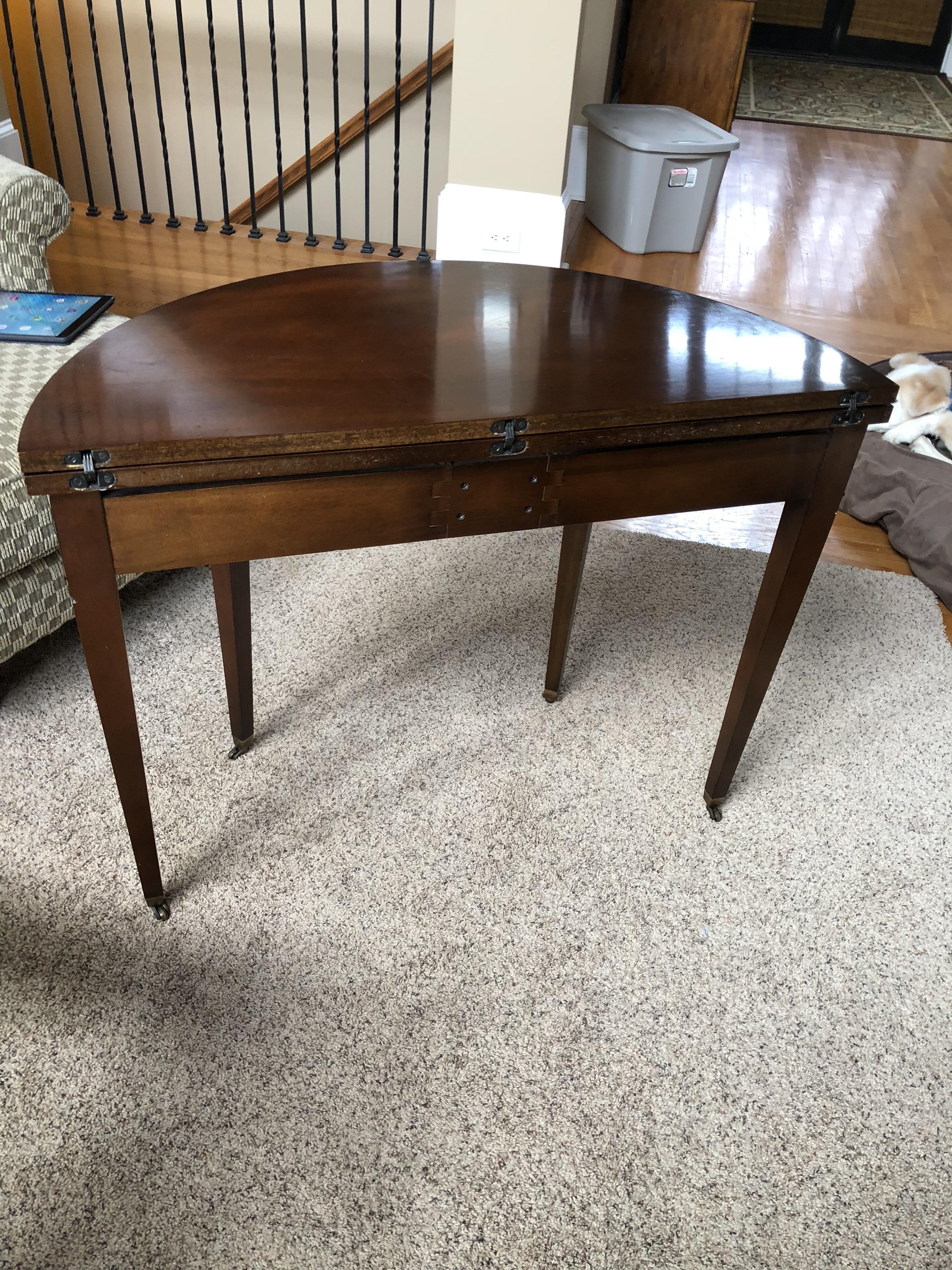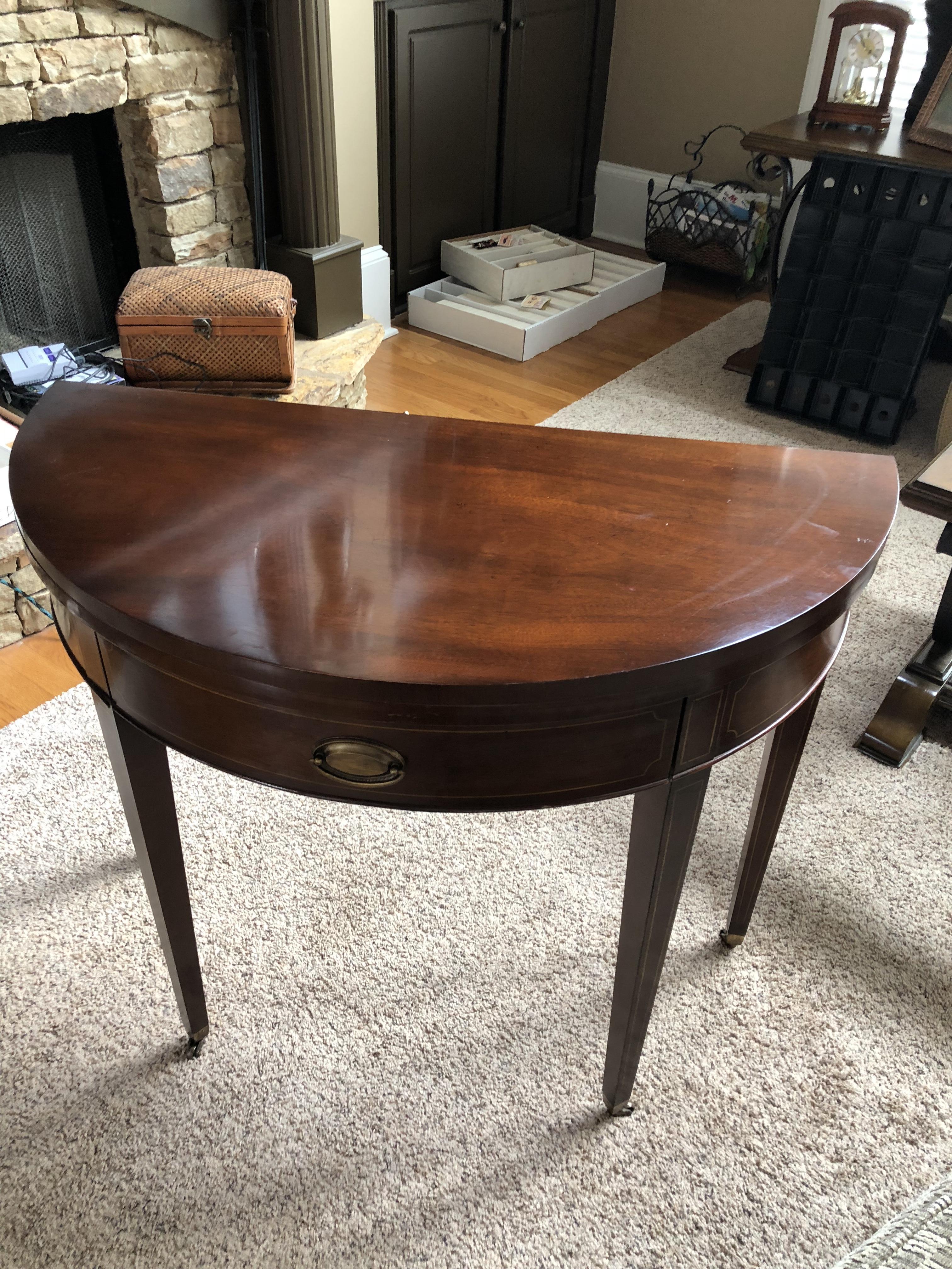 Looking for help with this table and value. It has a Mahogany Association sticker #184 in the drawer. On the bottom is has stamps of English Provincial Finish 1567 957. It has a flip top that takes it from a half round side table to a full round table. The legs flare out as well. It just adorable but I can’t find any info on it.