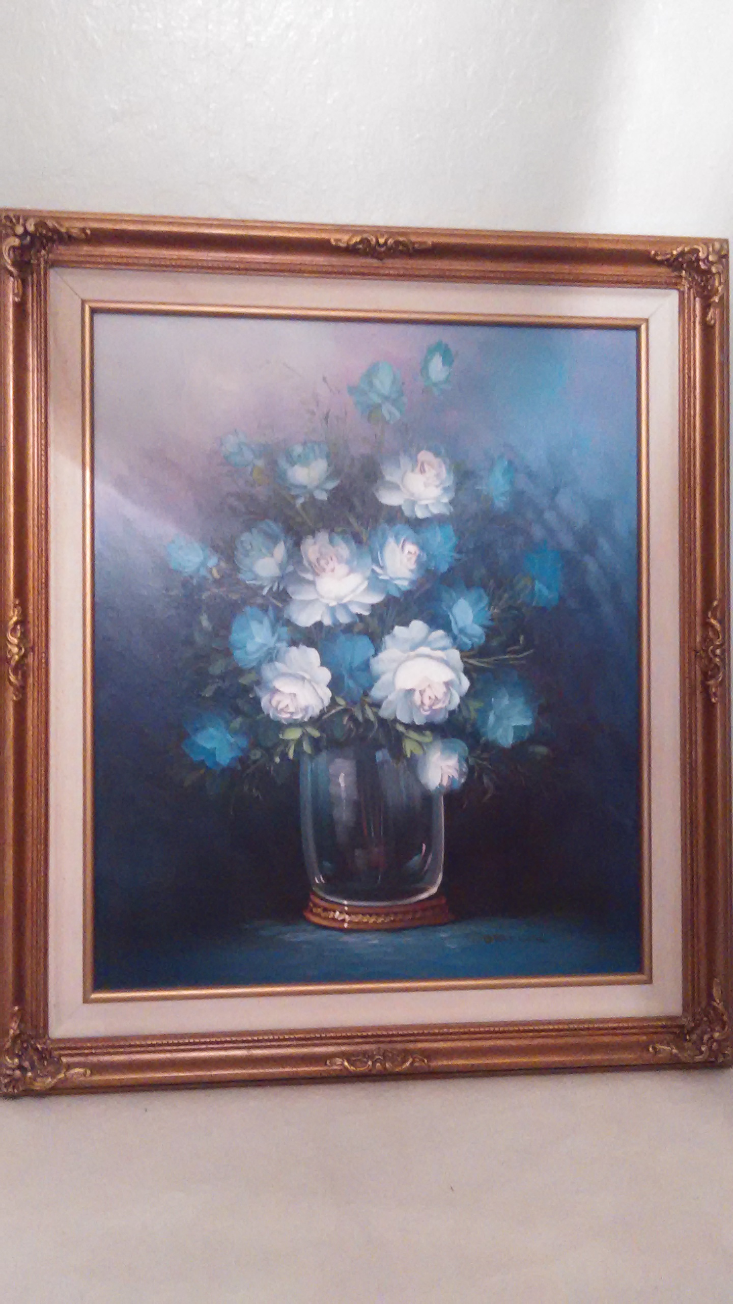 Floral oil painting on canvas by Robert Cox. Wood Gold frame. Frame is 26"x30" high. Medium is 19.5" horizontal x24 " vertical. Signed... Robert Cox. There is a chip in decoration on frame approximately 1 quarter" x1 half "on the side so its not visible from front. It has 2 bars added to frame for support. Frame is made in Mexico. Blue and white Roses in clear vase.