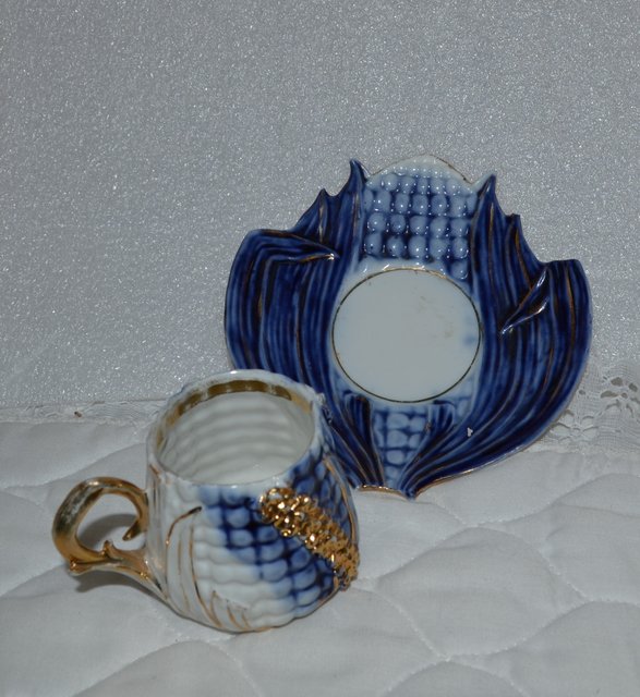 Flow Blue w/ Gold Corn Shape Cup demitasse and Corn leaf saucer