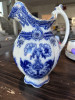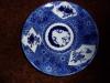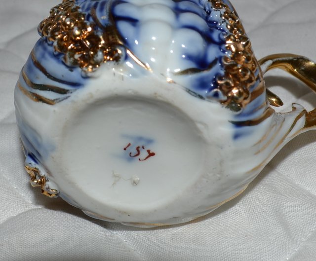 This is a little flow blue little tea cup or demitasse cup in the shape of an ear of corn and the saucer is in the shape if an ear or corn. Kernels of corn, the handle and the inside rim on the cup are gold gilded. The leaves on the saucer are also accented gold. There is a blue marking stamp on base of cup but it is smudged. Looks a bit like a volleyball net shape for lack of a better description. There are brownish numbers or letters 157 or 1ST ? brushed on over the blue mark. The saucer is incised with the number 6173. I believe there is another incised stamp that looks a bit like an elephant but not sure about that either.
