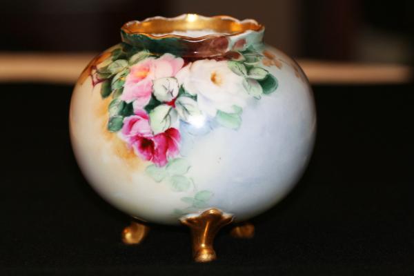 Flowered 3/legged bowl. Signed Coyne '08. Don't know if this is Sallie Coyne - the time frame is right. Excellent condition - no cracks, no chips, no breakage of any kind.