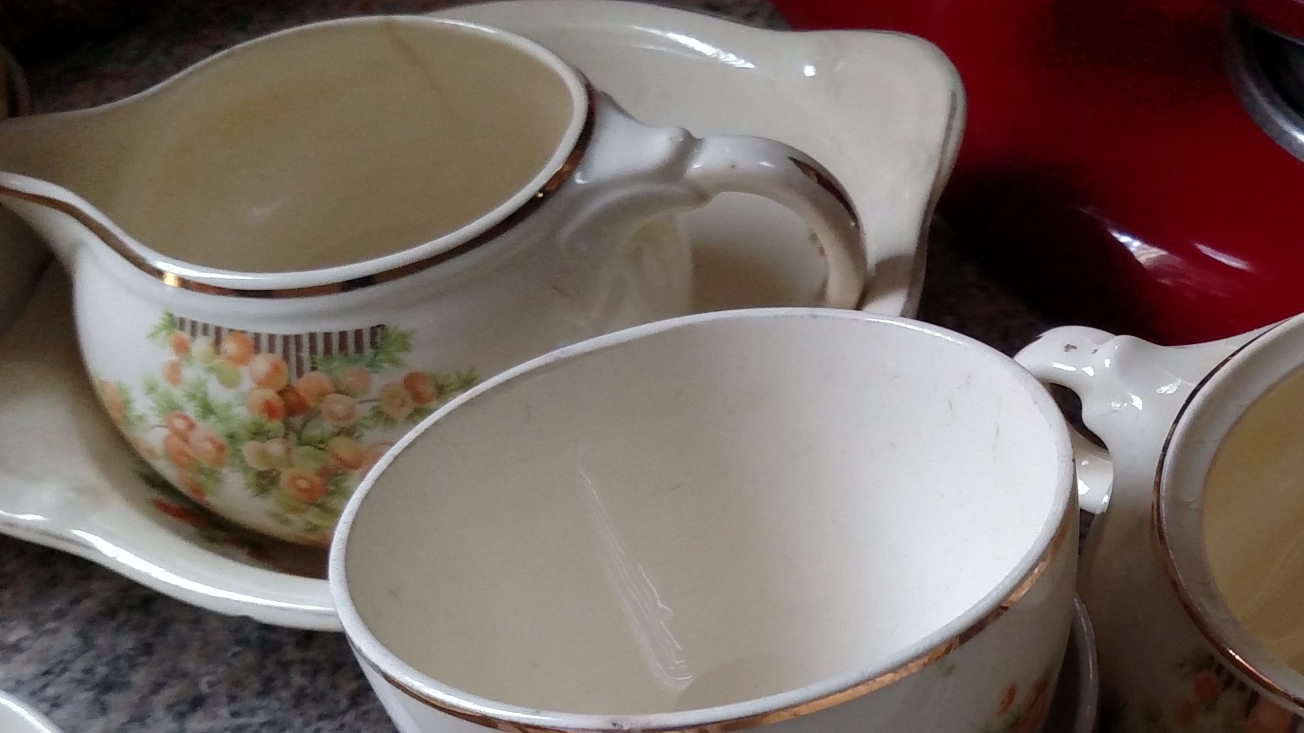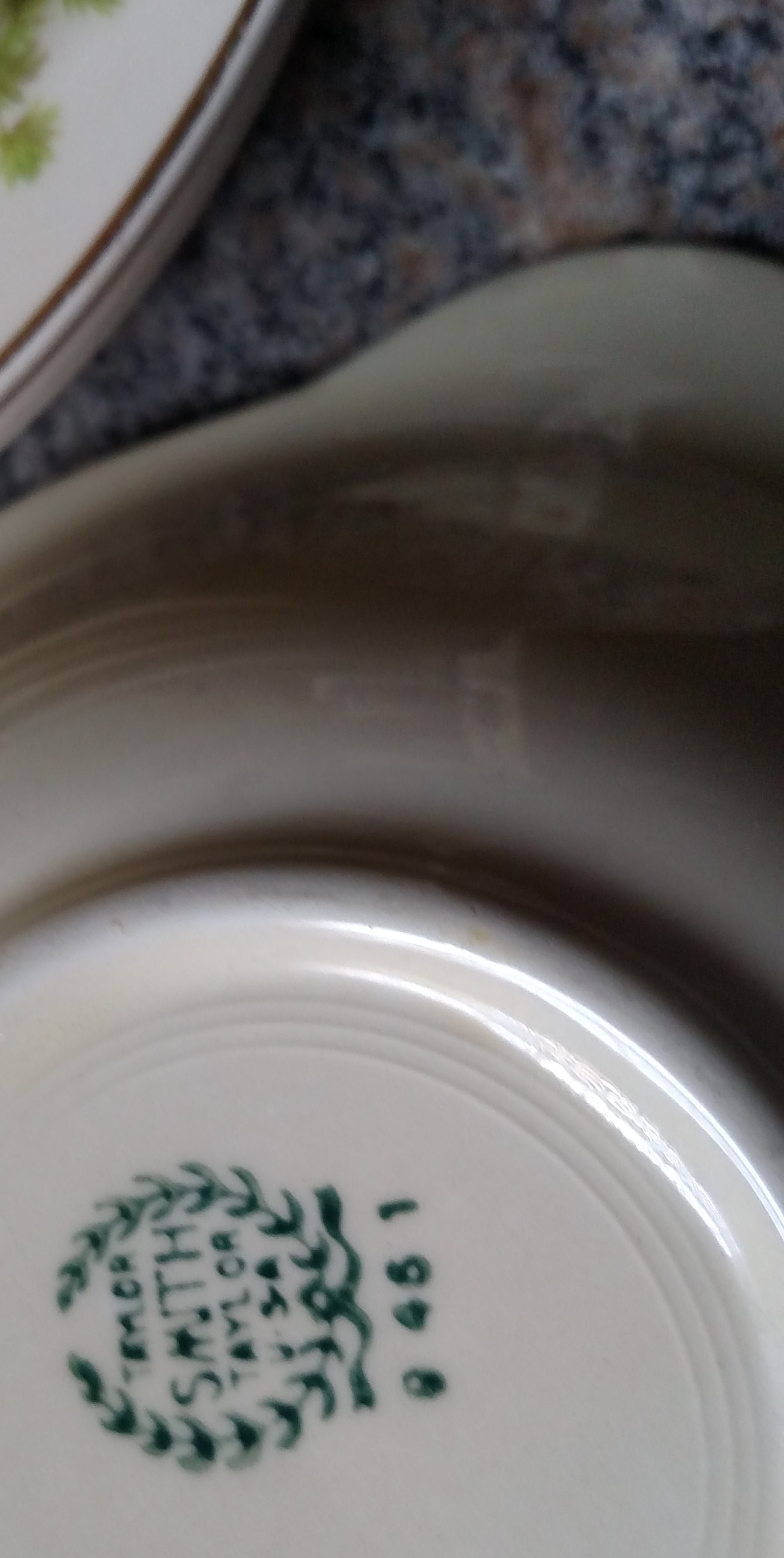 My grandparents bought this set early in their marriage and when Grandpa passed away in 1974, they had been married 60+ years. I would like to know about the estimated value but more inportantly when this set was made and the name of the dinner ware set if there was a name for the design, Any information would be greatly appreciated.