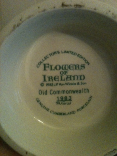 I have a 1983 Collectors edition Flowers of Ireland Ceramic container with a 7 year old bottle of whiskey that has never been opened. All the original labels are in tact even the state liquor seal.  JP van Winkle & Son Old Commonwealth 1983 (initials RGW) and genuine cumberland percelain on the bottom. I was wondering how much it is worth.