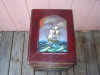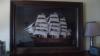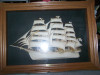 shadow box containing a bone carving of a sailing ship with cold painted highlights on a grey wool background, brass plaque at bottom with Flying Cloud 1850, on the back is sticker says turner wall accessory and stamped made in USA, the box is wooden and made of nice walnut or similar wood and has glass cover