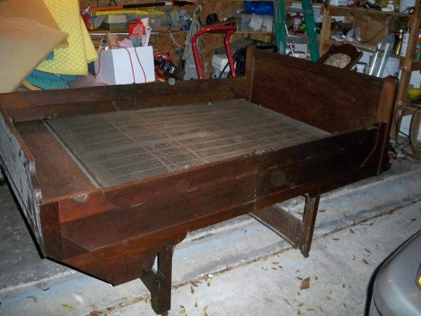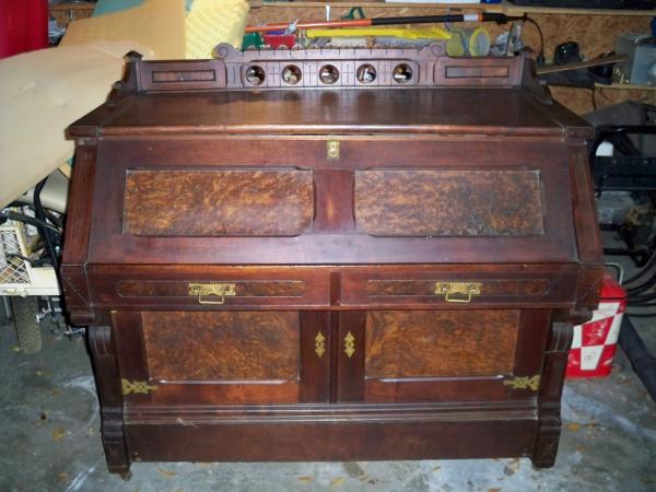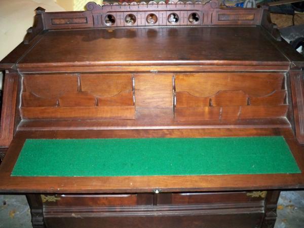 I don't have the dimensions of the desk however the pictures pretty much tell what it does. the desk sits on small metal wheels, cond. appears to be fair/good few scrapes and scratches and don't see any noticeable repairs.