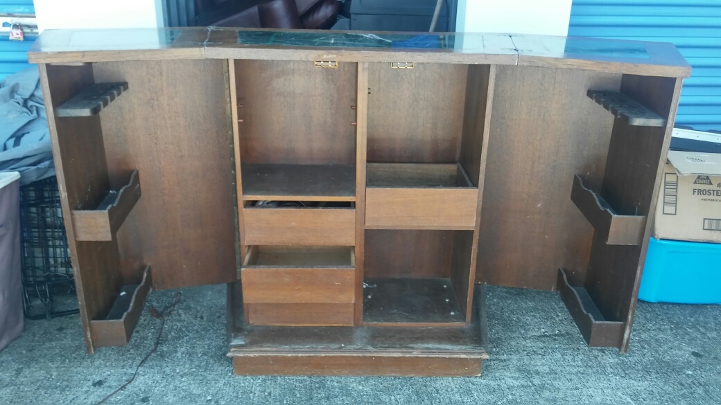 Portable Bars like this tended to be used in Conference centers, Restaurants and Hotels from the 1950's through 70's, some actually mounted on wheels for easy movement from room to room. Very few of them have any maker's markings or labels to identify a maker, but most were mass produced by companies that specialized in commercial furnishings. Values for them tend to depend a great deal on their condition