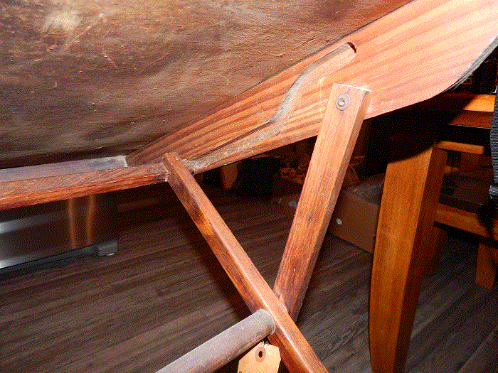 A wood folding table. grooves in wood for table to fold are all done by hand. Top seems like its made of cardboard with a horse photos on top. Has an auction Tag on item. Says 85.00
