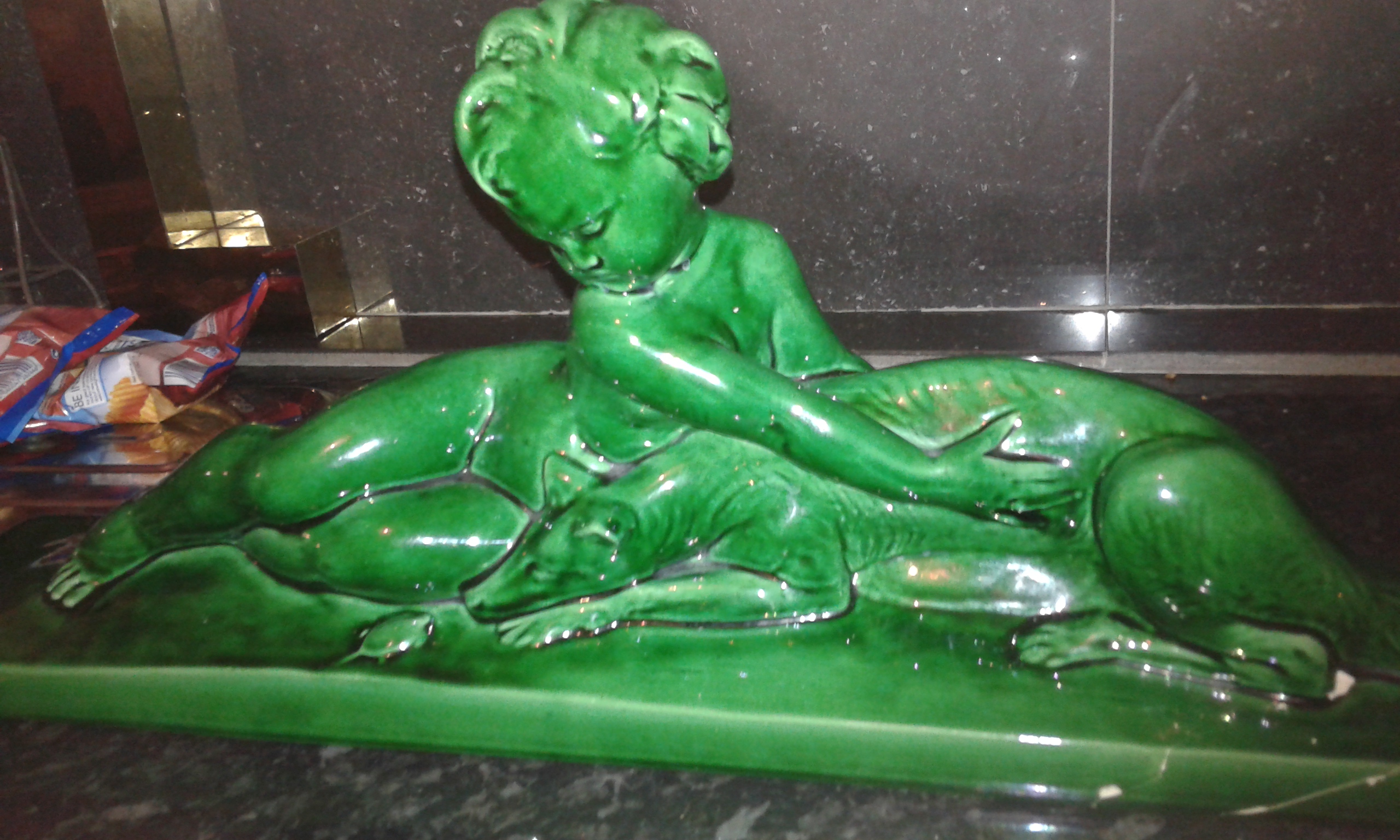 circa 1920s ceramic sculputure by artist A. Fontana, representing a boy with a greyhound. The sculpture is a family legacy and is approx 20x20x80cm.