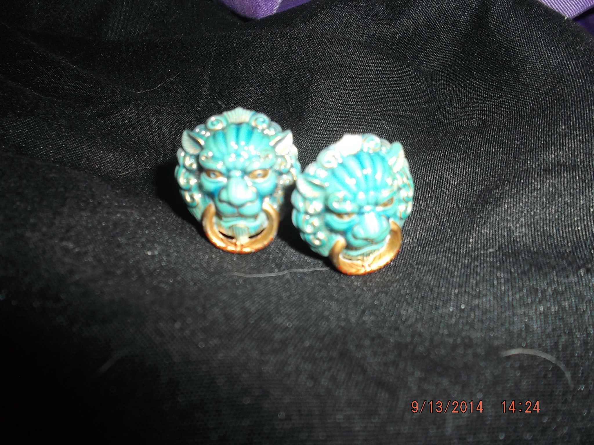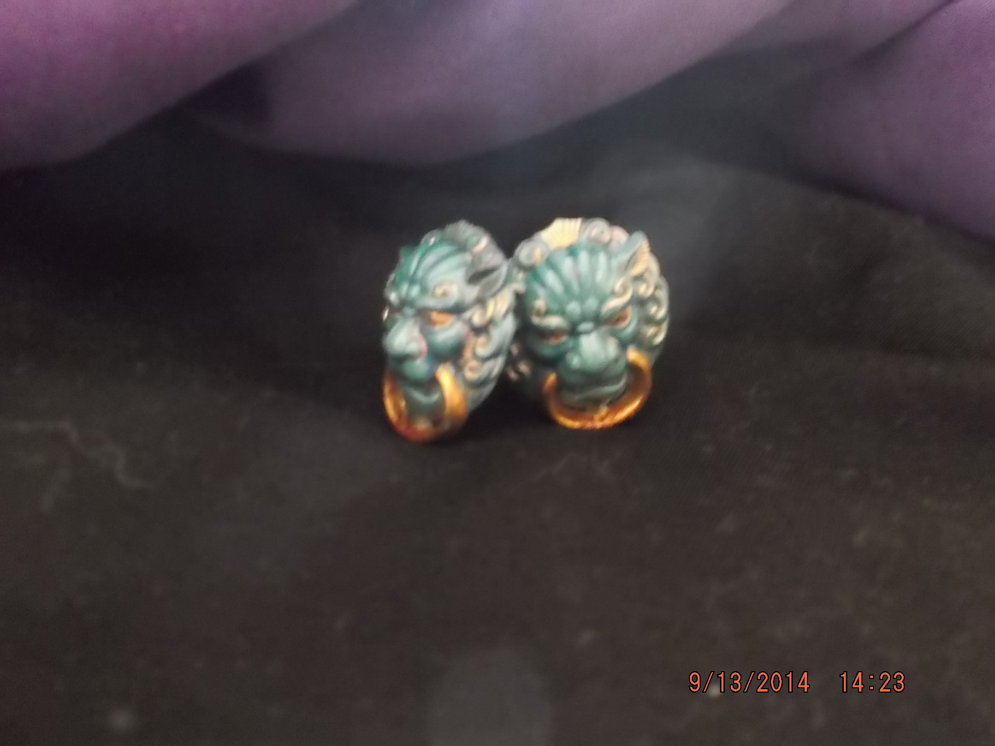 CERAMIC AND SILVER FOO DOG CUFFLINKS. when the light hits theses faces you can see multipule colors.