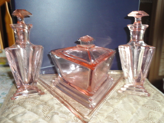 Pink glass footed triangle powder/trinket box with 2 matching perfume bottles on triangular tray. This set was owned by my aunt and discovered in the attic 30 years after her death. She died in her 80s. I have not been able to find another like it anywhere. This set is in extremely good condition with no cracks or nicks. Would love to know anything about the history of it and what it may be worth.