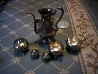 tea spout, milk bowl, sugar bowl, cream bowl, salt and pepper shakers