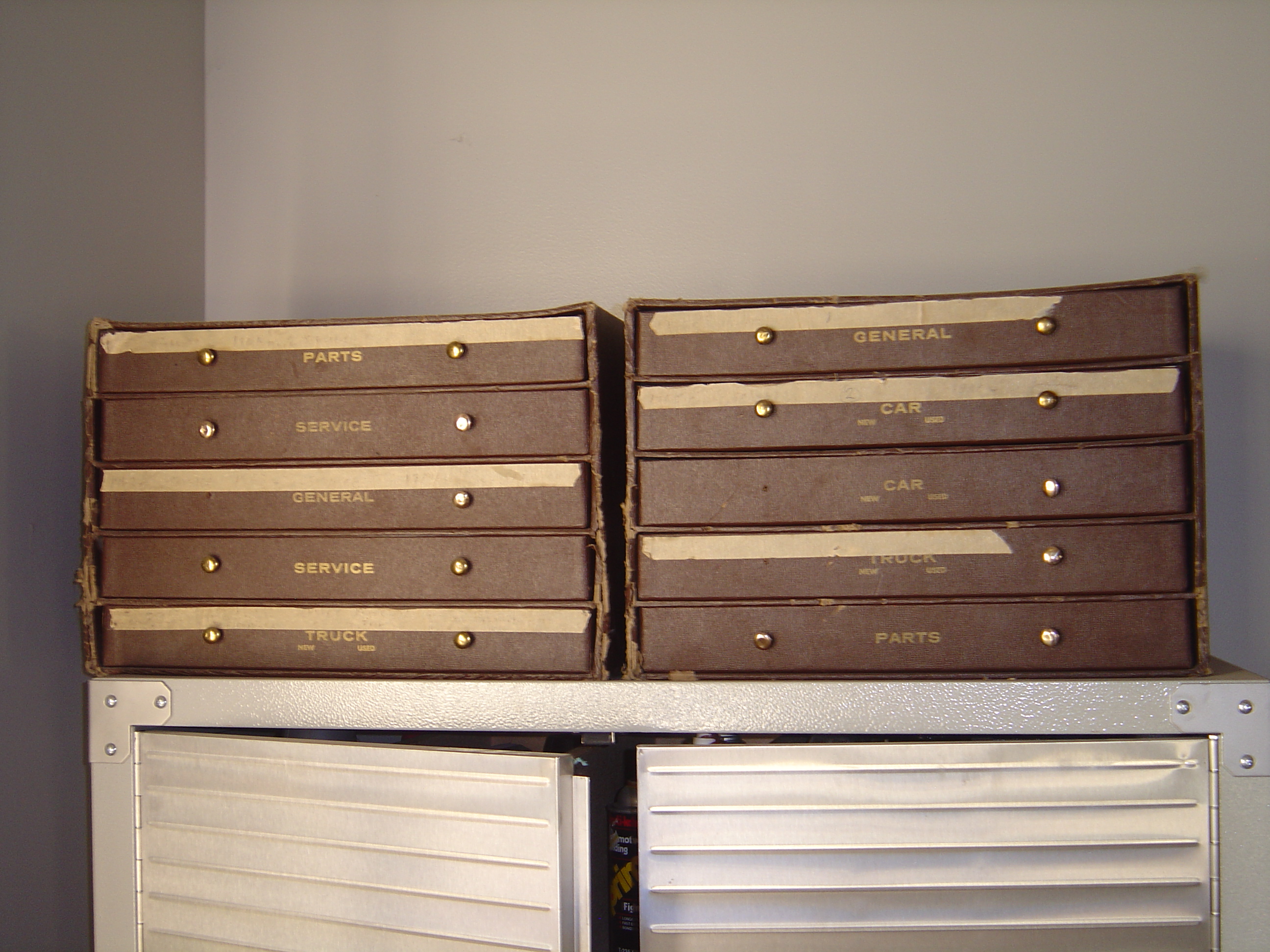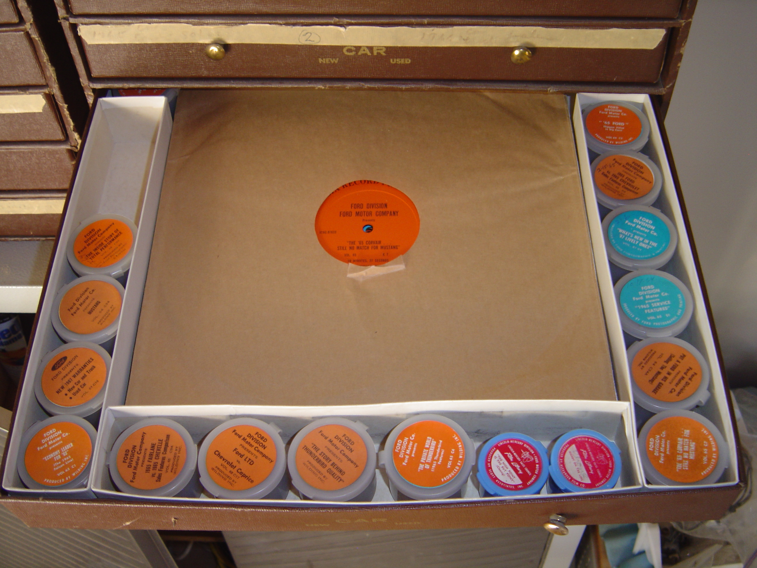 This is a collection of 35mm filmstrips and long play records I purchased from a Ford dealer. The subject matter is sales, promotions, service tips, training, etc for Ford cars of the 60's. Nearly 200 titles. Includes introduction of Mustang, Falcon, Bronco, and much more. Includes projector with turntable. Film advances when record beeps. Case serves as screen for viewing.