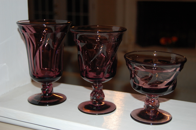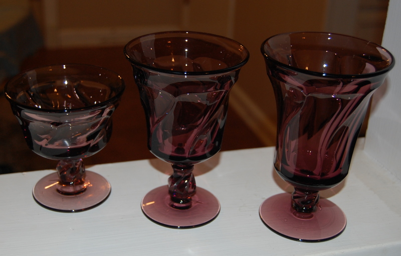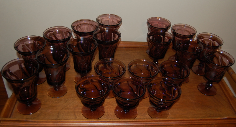 This is a beautiful set of 20 Fostoria crystal goblets(Jamestown pattern Amethyst color), including 8 iced tea goblets, 6 water goblets, and 6 sherbet goblets. They are in EXCELLENT condition, as they were never used. No chips or cracks in any of the glasses.