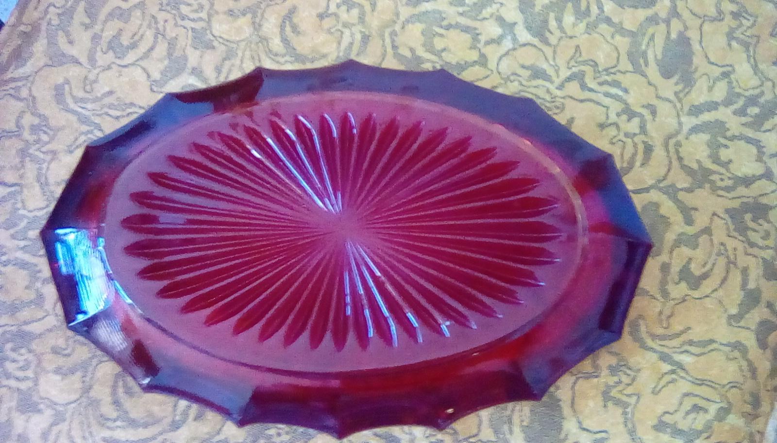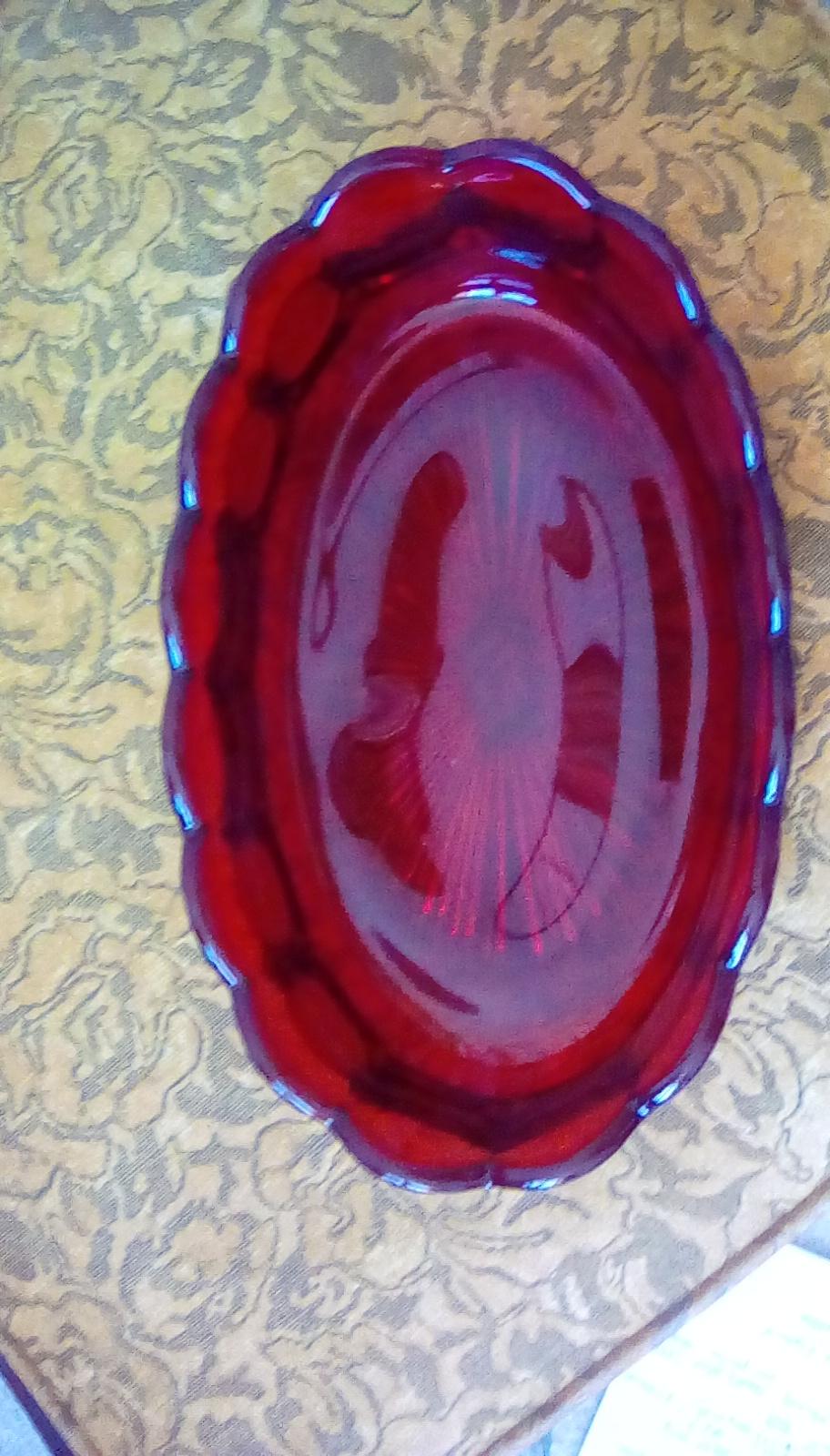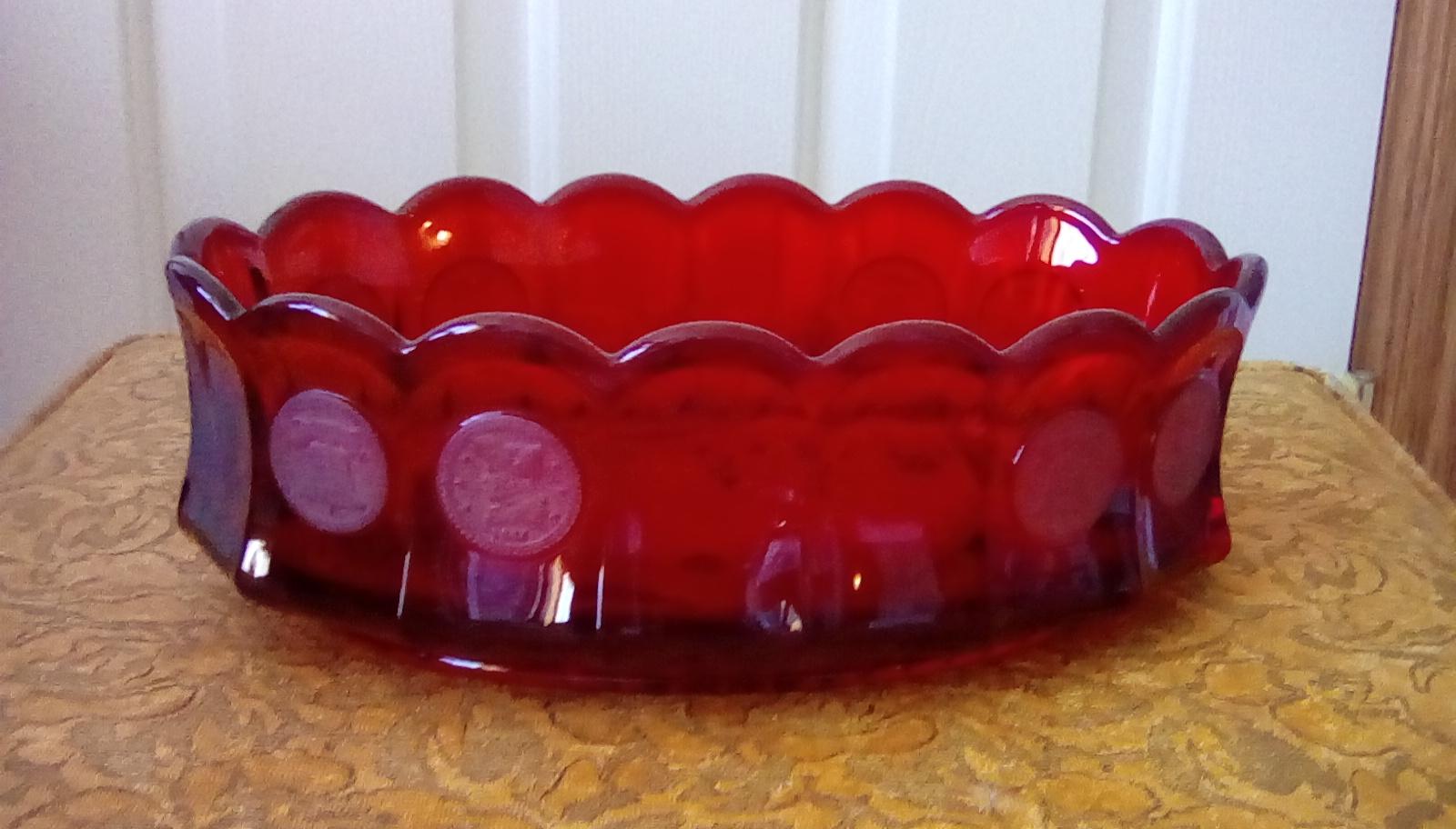 Red fostoria coin glass. Oval serving bowl 9" at widest point 3.25" deep