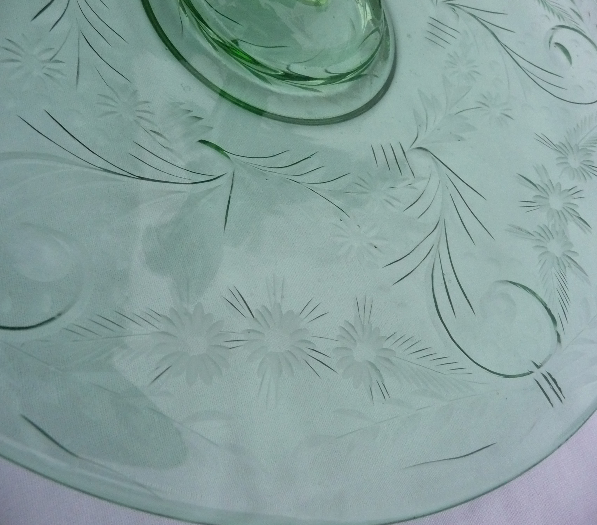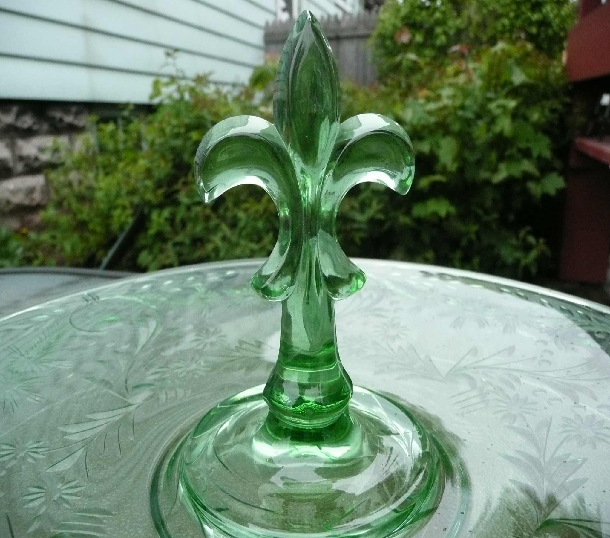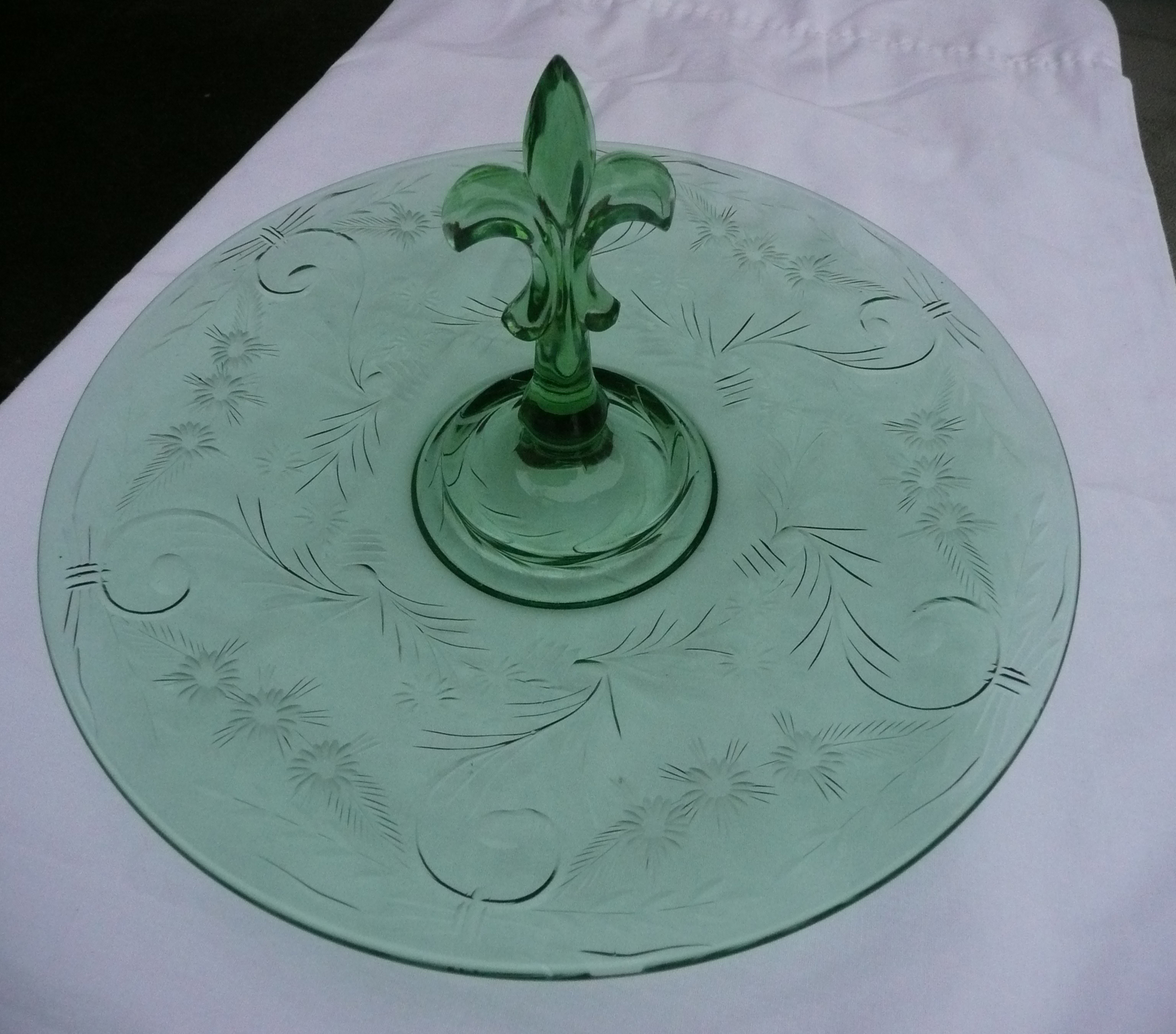 I believe this may be a Fostoria piece made around 1924 but not quite sure. Any help in identifying and the value of this piece would be appreciated. Known as a servicing or sandwich tray has an elegant etched pattern which I do not know what kind. The handle has the Fleur de Lis design. The tray is approximately 11.50" across with the handle rising 4.50". Never used and in excellent condition. No chips, cracks or scratches.