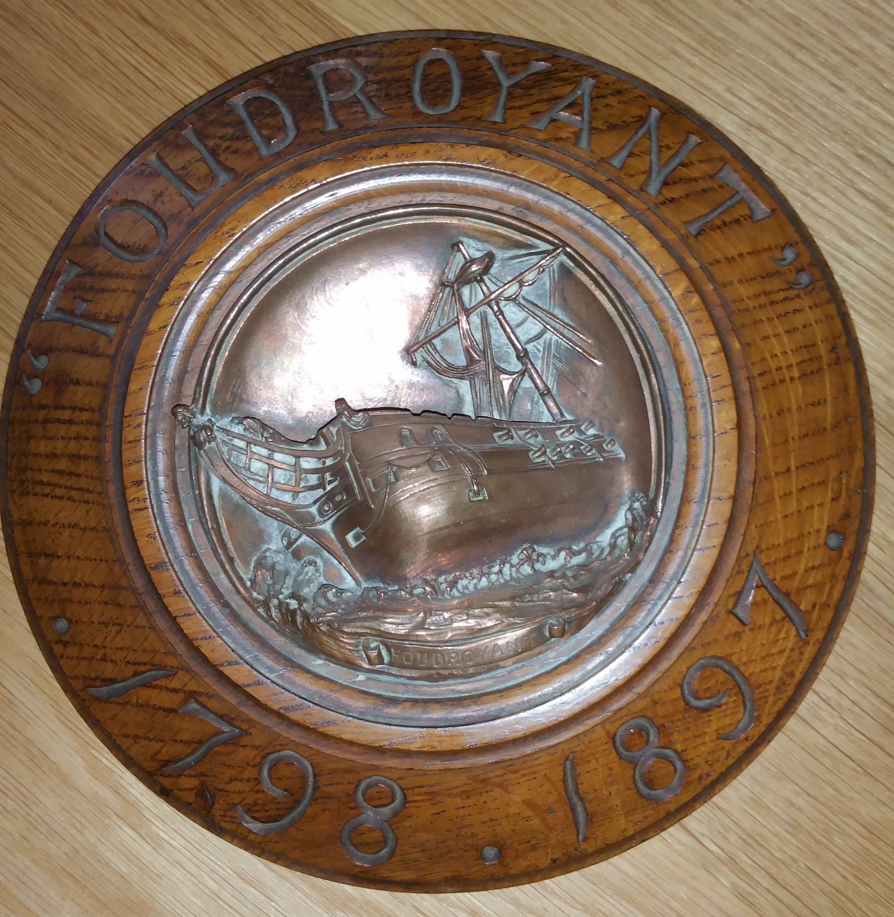 A circular round wooder plaque with a copper centre featuring the Foundroyant.