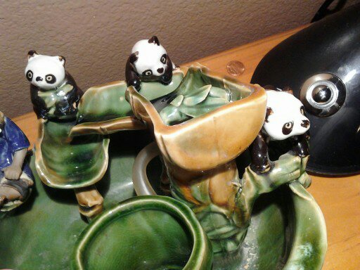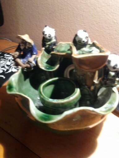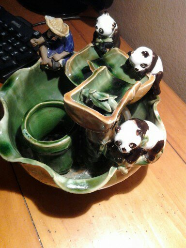 GREEN GLAZED BOWL FOUNTAIN WITH AN ASIAN FISHERMAN AND 3 PANDA BEARS SITTING ON THE EDGE OF THE BOWL IT ALSO HAS A SMALL PLANTER INSIDE THE BOWL FOR PLANTING A SMALL BAMBOO PLANT ... WATER FALLS DOWN 3 BAMBOO STALKS INTO THE BOWL