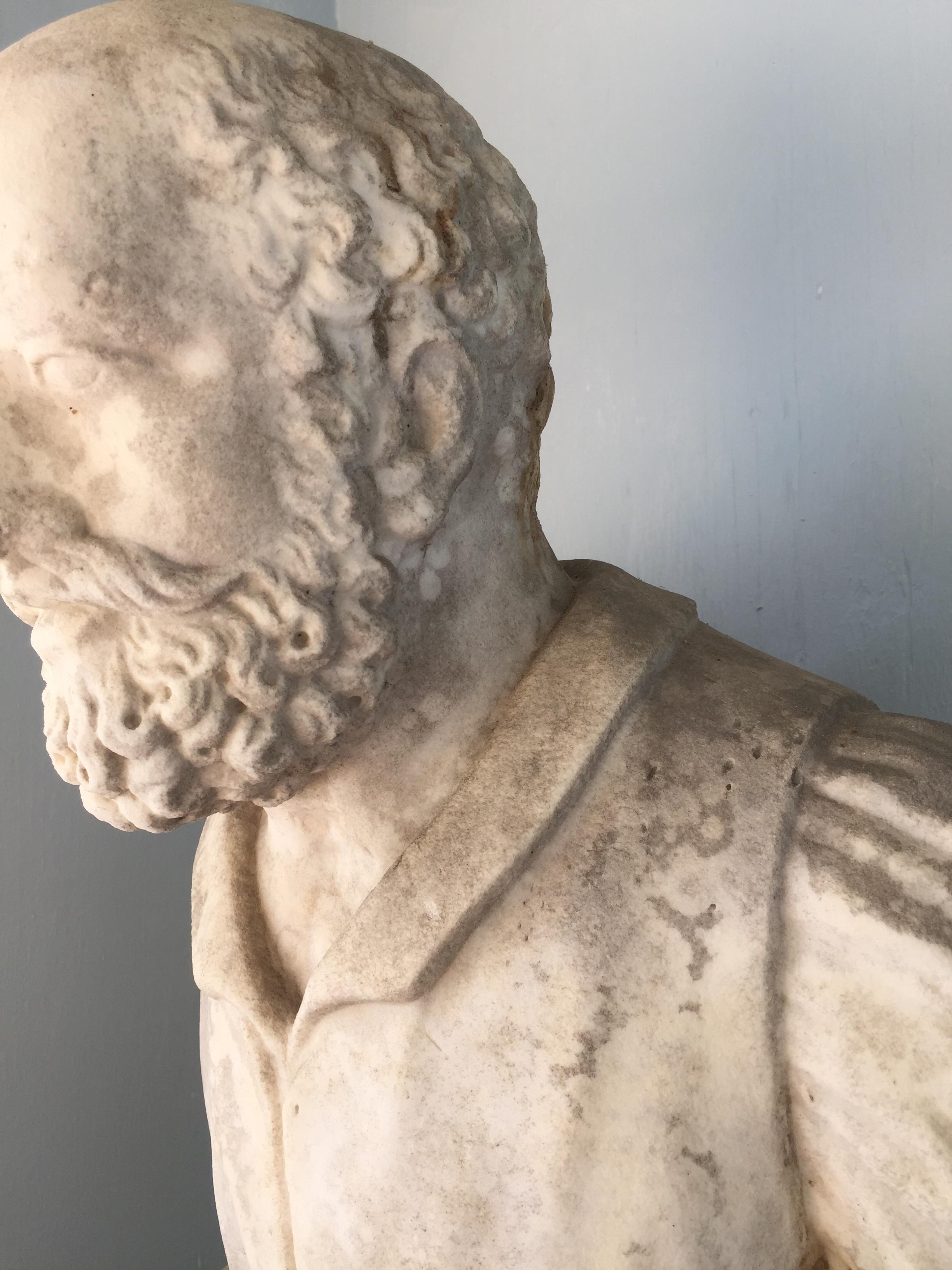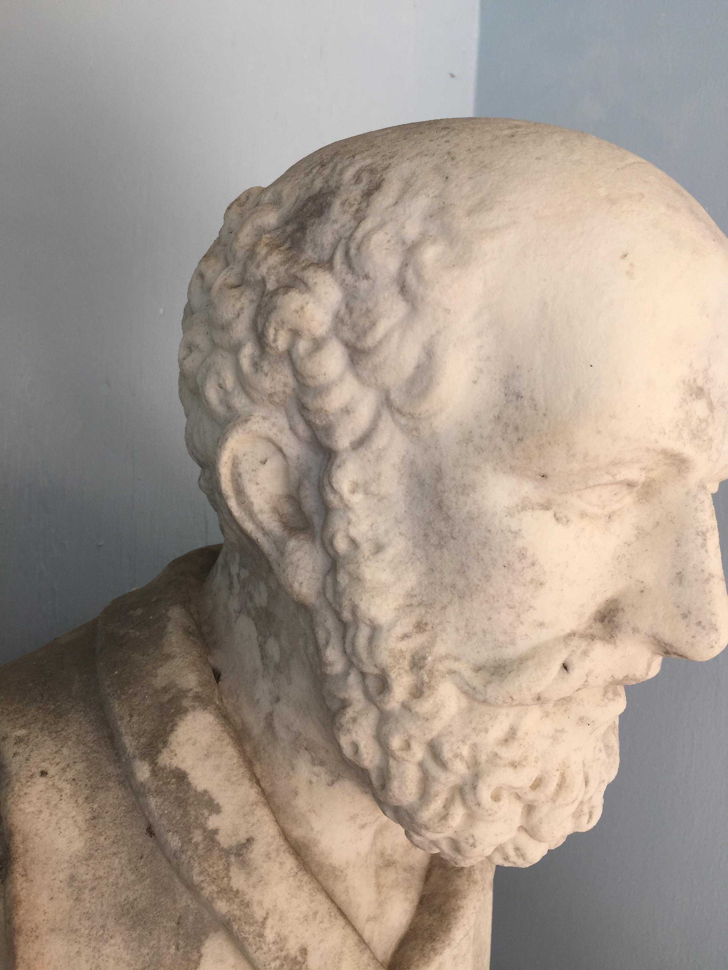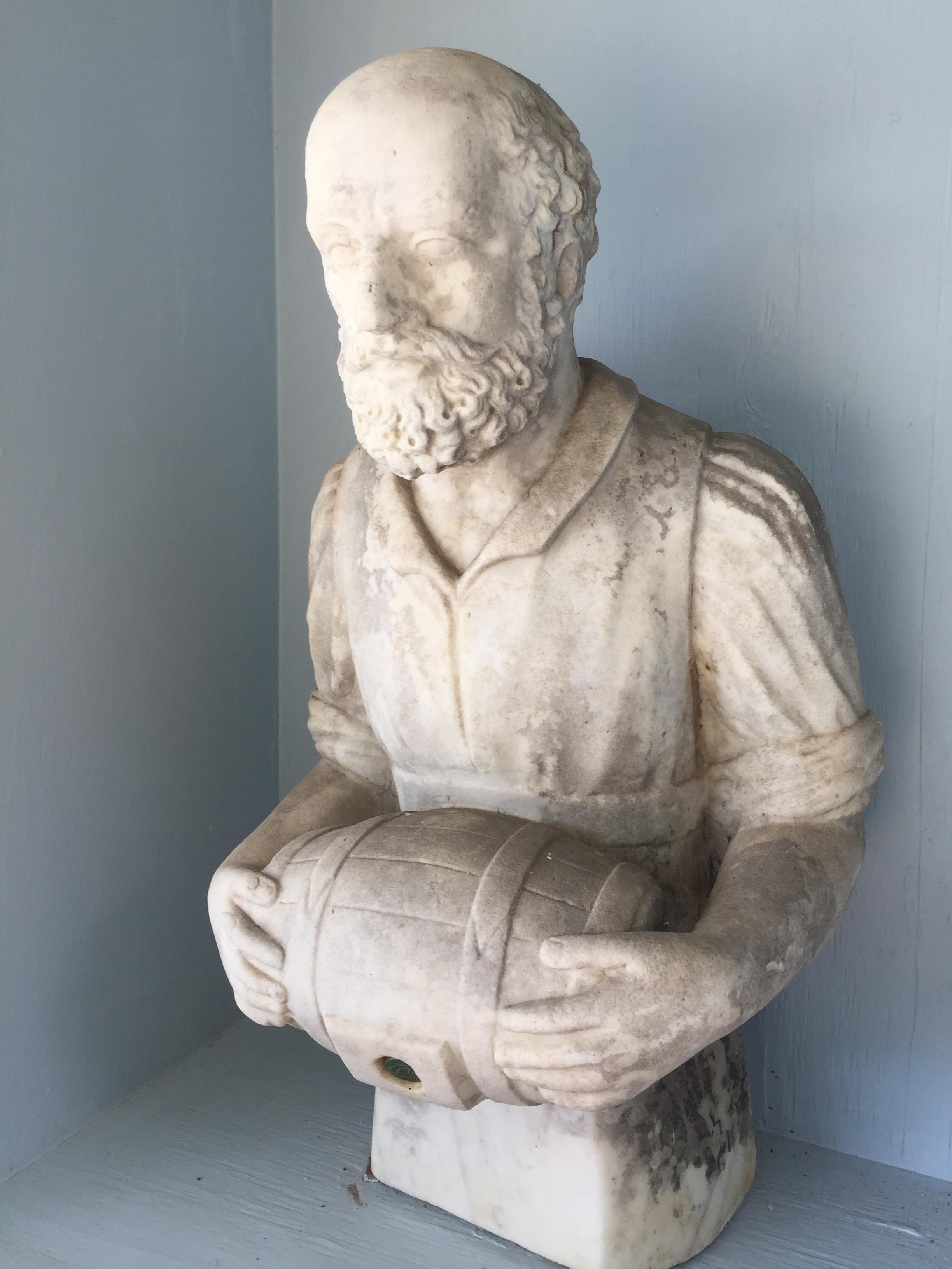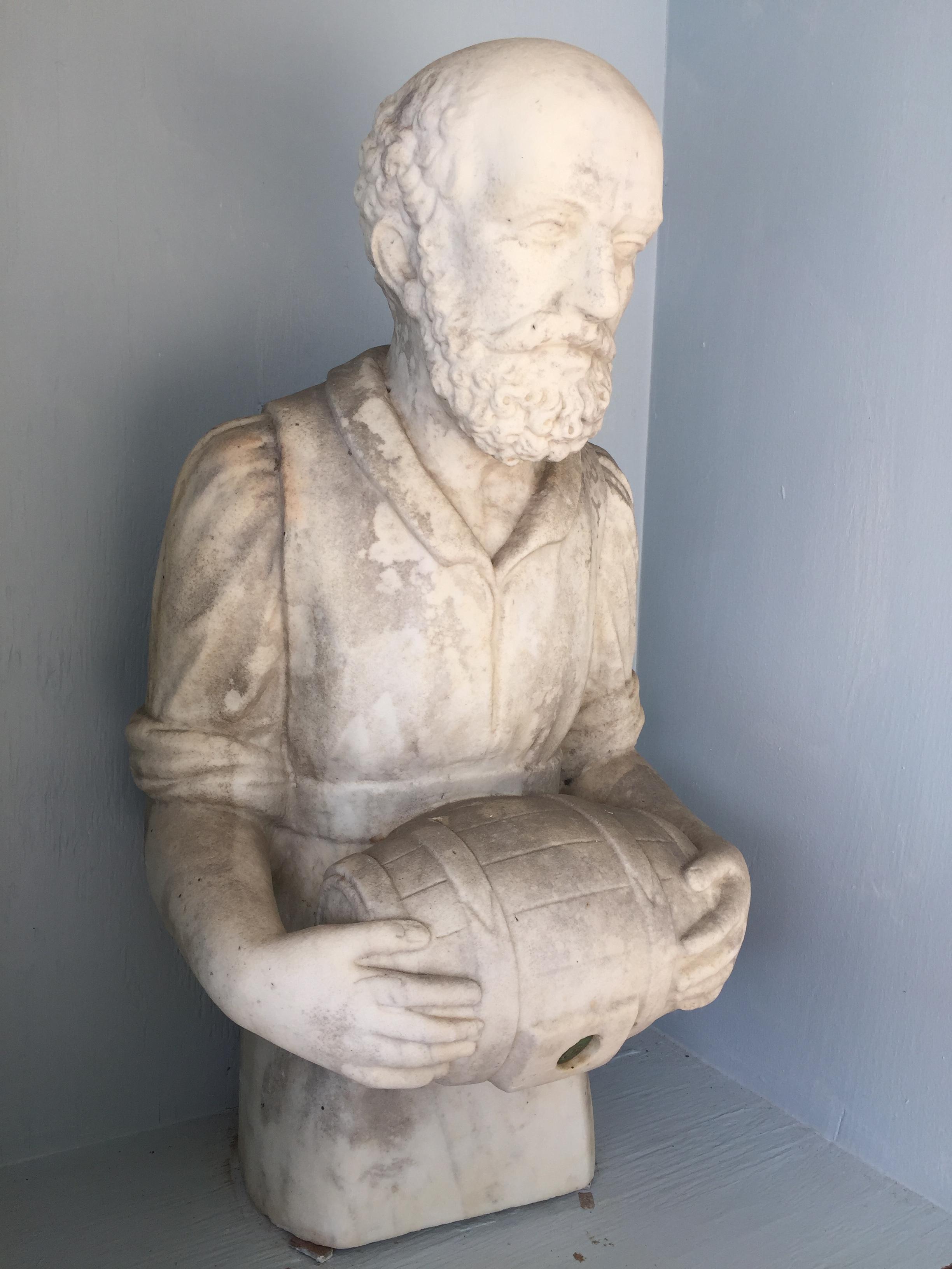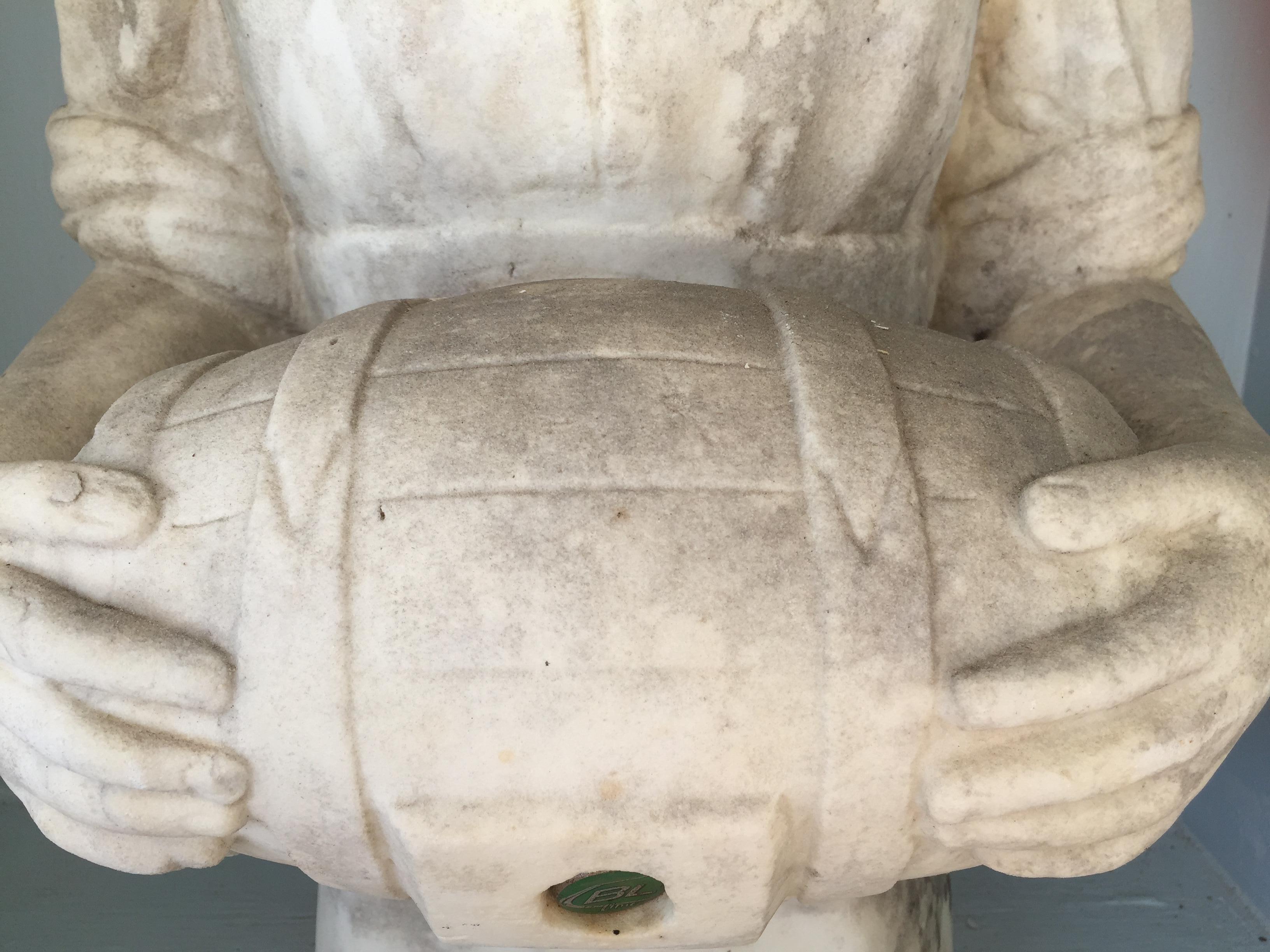 Fountain Figure of a man with a lot of detail. Seems to be carved out of white marble. i think its was a water fountain at one time. There are no markings on the figure at all.