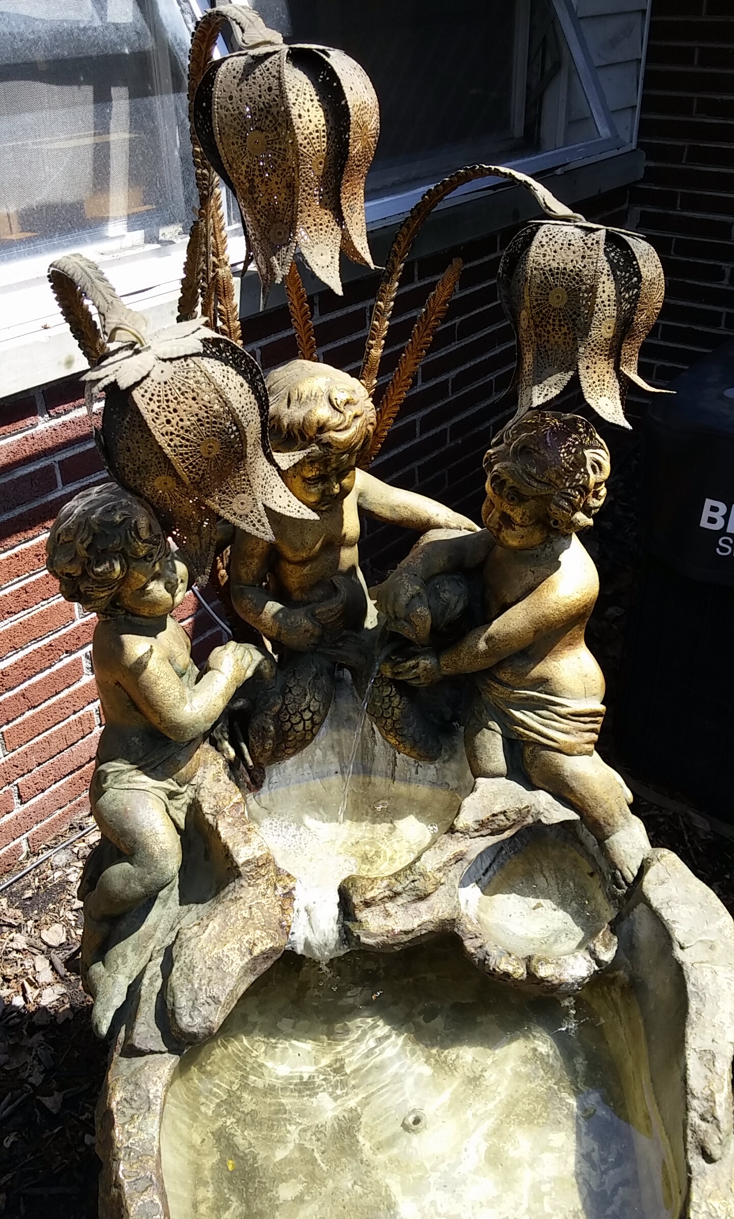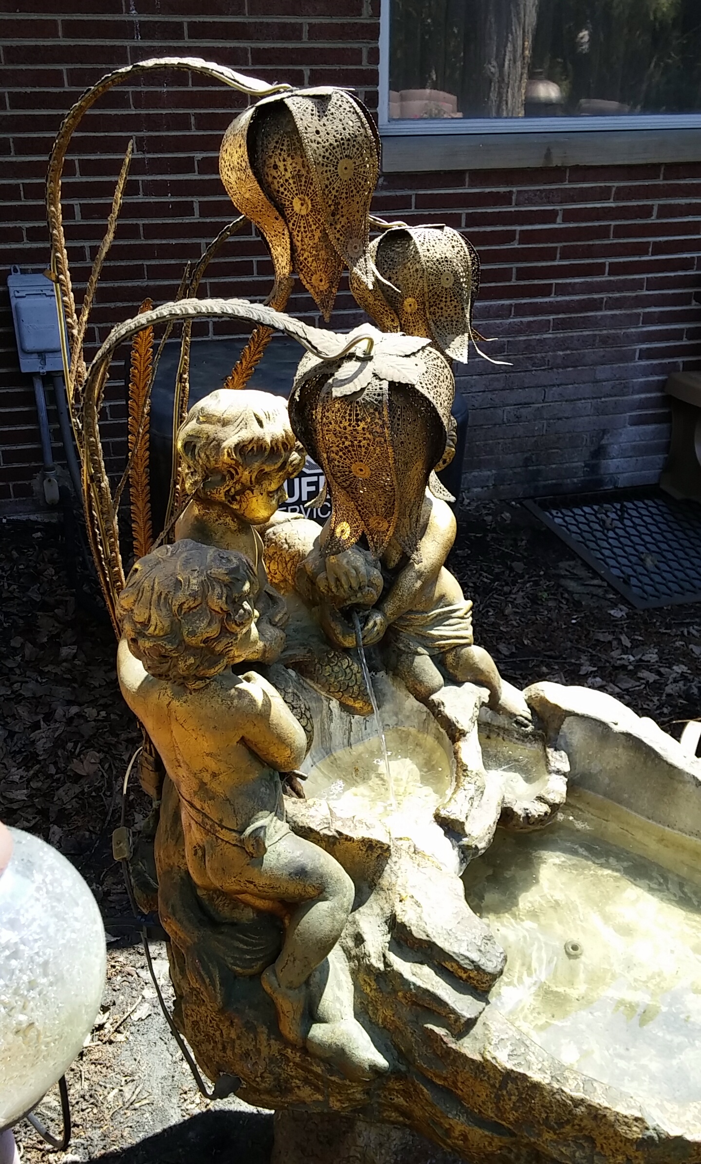 Need help trying to fiqure out the value of this piece. I cannot find anything that even compares to this fountain. 3 Cherubs with fish that stream water ( 2 copper streams) into this beautiful fountain..3 very detailed brass or copper Victorian lights that lights up each churub. Churubs look to be cement ..Came from a estate in Detroit MI... I was told it came out of Rosa Parks estate but I cannot confirm that. Piece is marked but I cannot make out the markings... Please help me determine what the value is...I have been trying to do alot of research but nothing compares .... very odd piece...help!