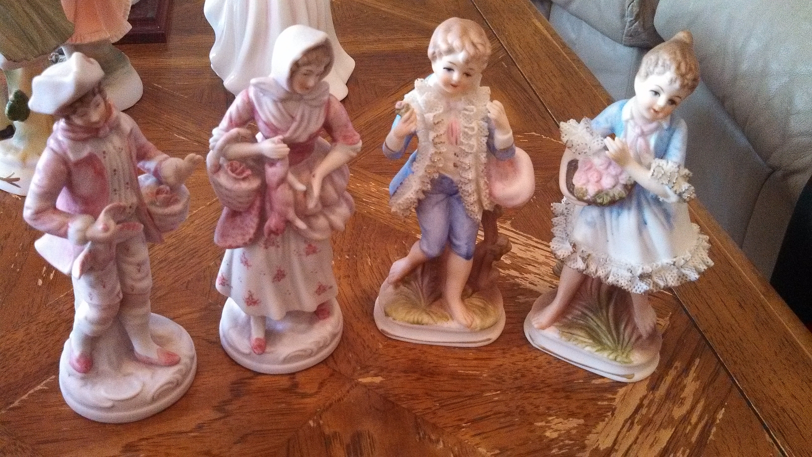 Can anyone tell me more information (maker, valuation) about the four figurines pictured?  There isn't much to describe about them other than that the blue figurines have no markings on them whatsoever, while the pink figurines have the numbers 6059 printed on the bottom.  They stand about 6-7 inches tall as well.  Thanks!