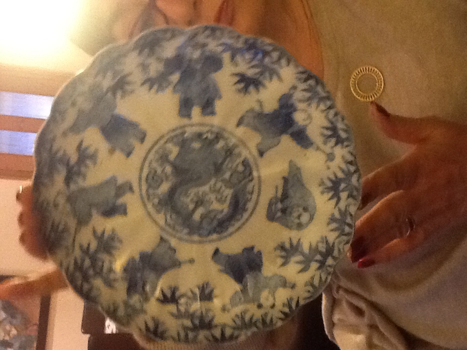 Blue and White, Fluted, Japanese plates with Chinese children playing and a dragon in the middle.