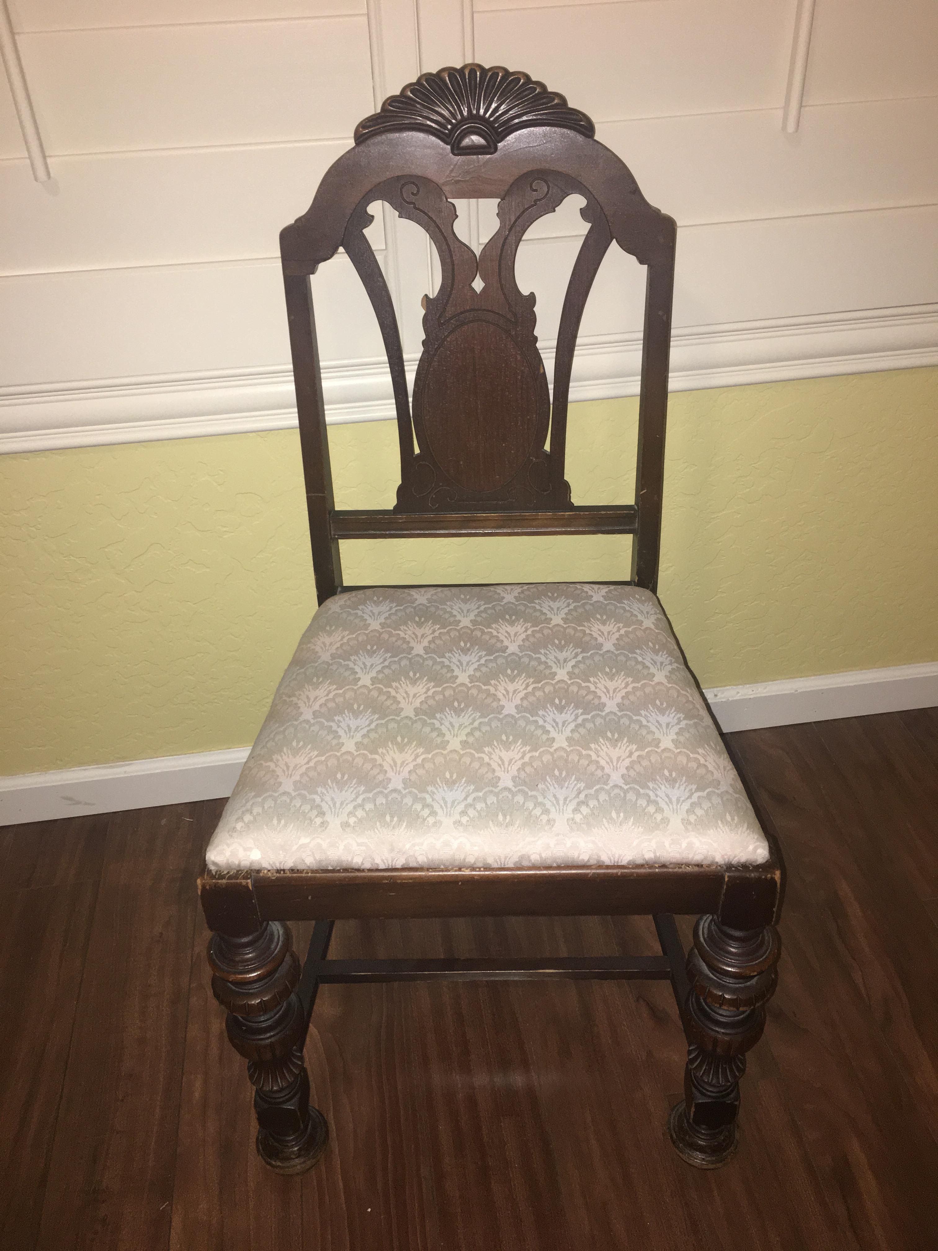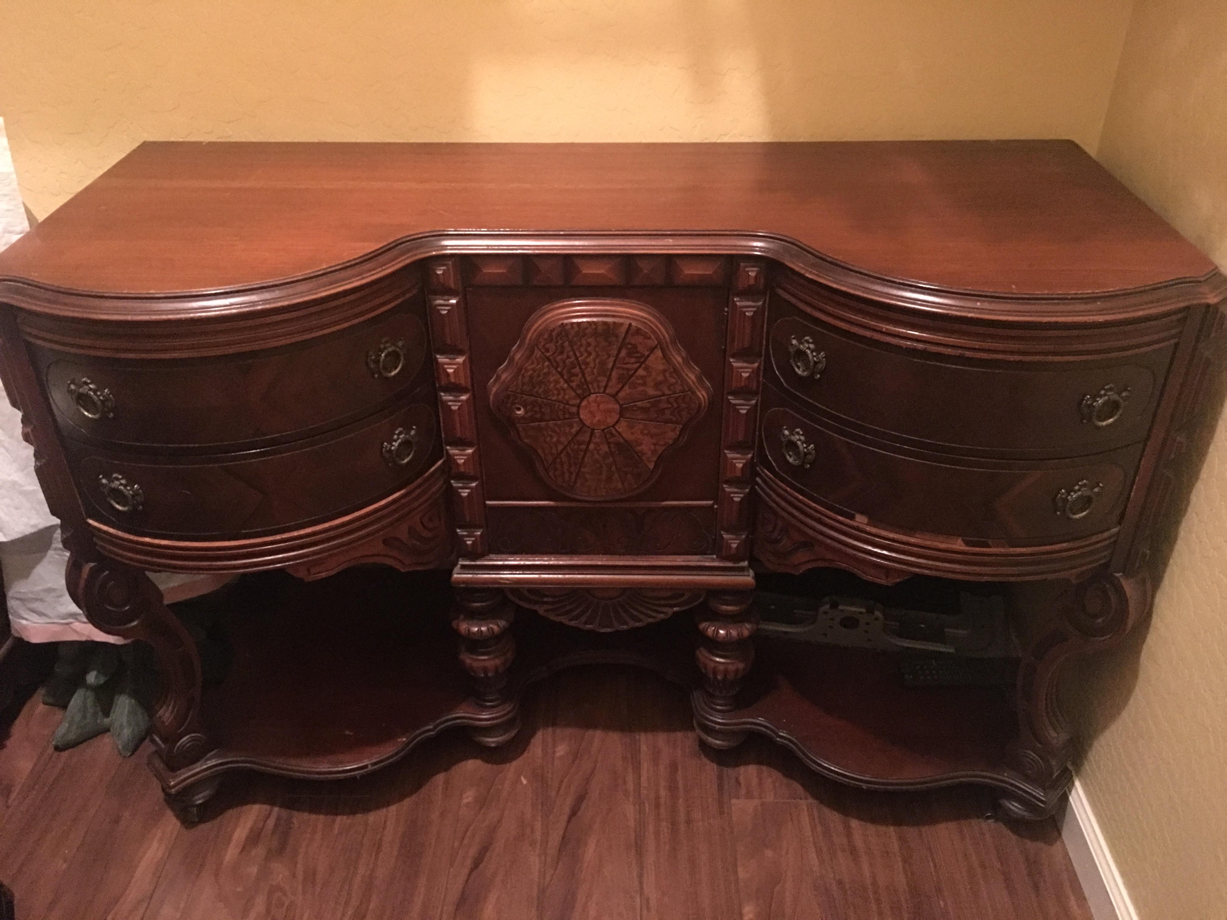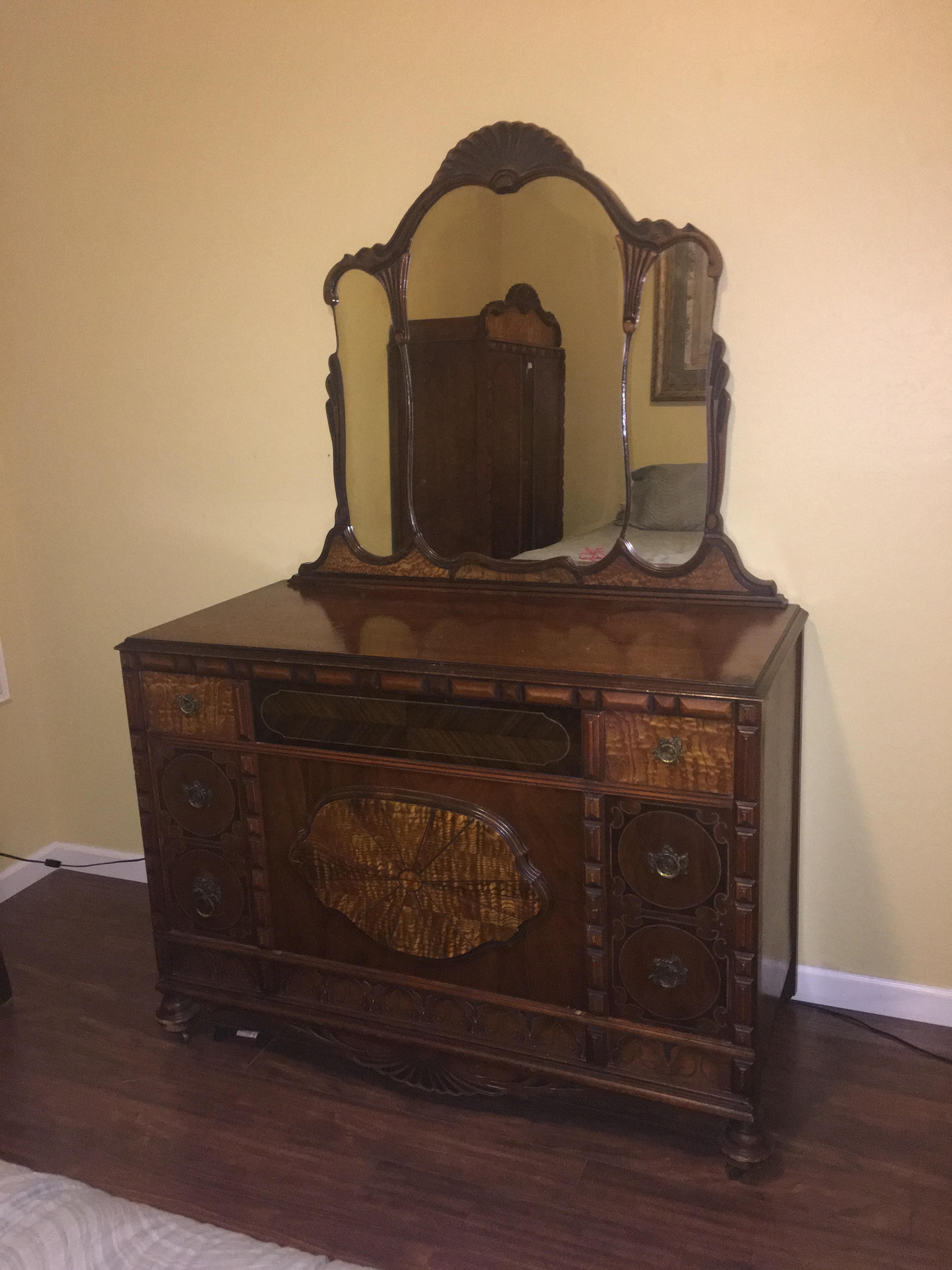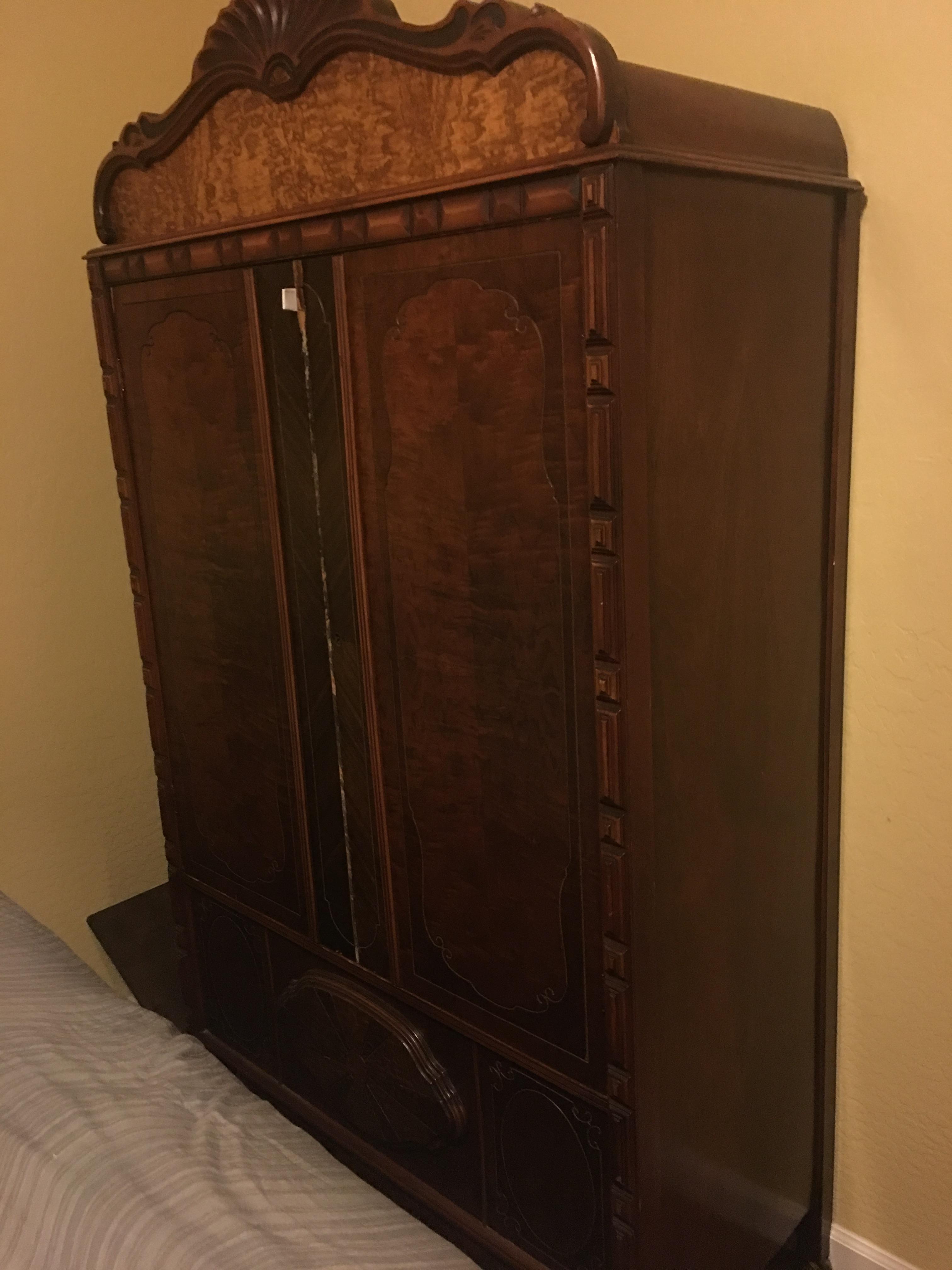 Four piece antique bedroom set with chair, dresser with mirror, amoire, nightstand and sitting table.