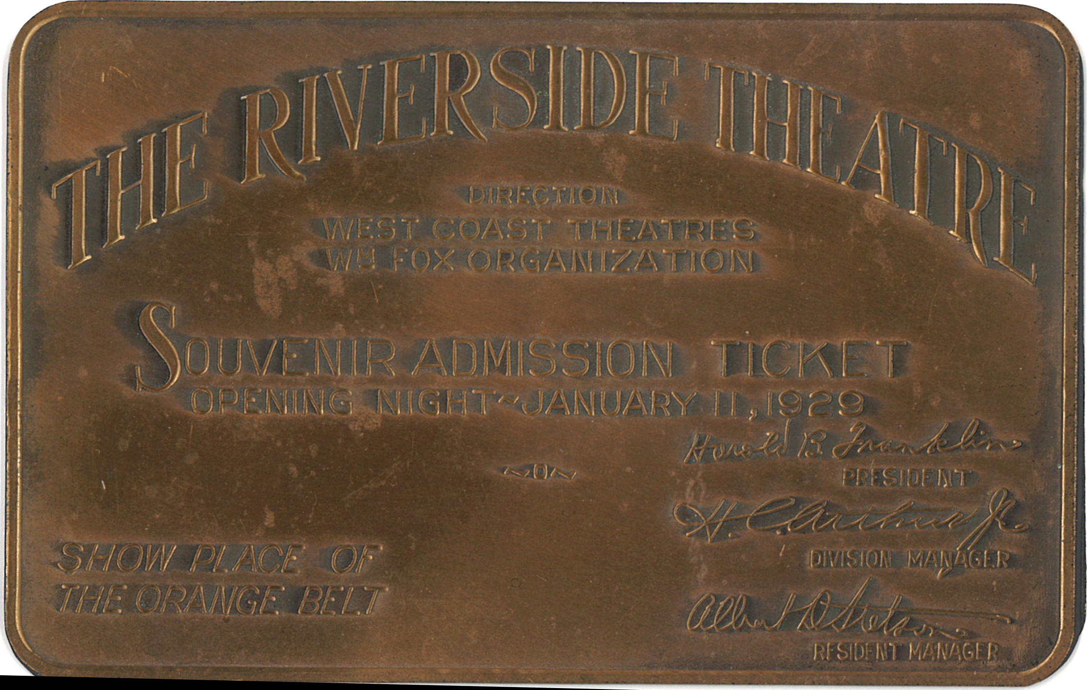 I have a copper souvenir ticket from The Fox, Riverside, California. On the left lower side of the ticket it states: The Show Place of the Orange Belt. On the lower right side, lower part, are the signatures of the President, Division Manager, and Manager. At the top of the ticket is The Riverside Theatre, West Coast Theatres, Wm Fox Organization. In the middle is Souvenir Admission Ticket, Opening Night, January ll, 1929. My ticket is in excellent conditions. No dents at all.