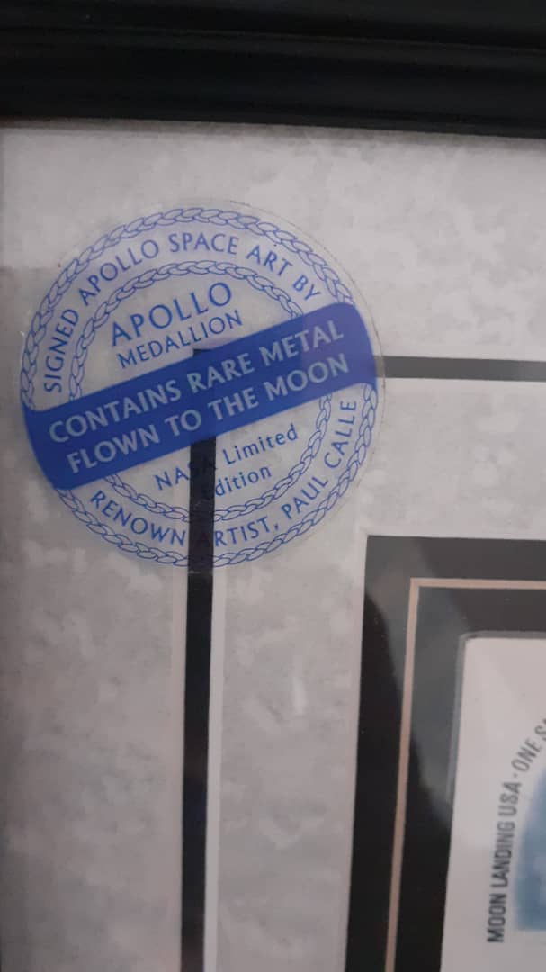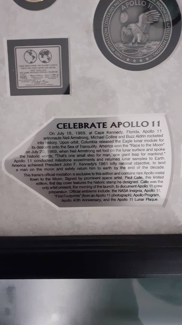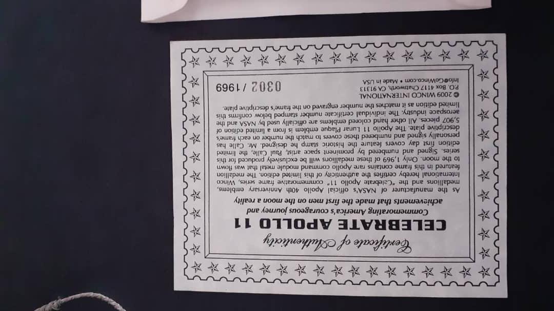CELEBRATE APOLLO 11 Commemorating America's courageous journey and achievements that made the first men on the mean a reality As the manufacturer of Magas oficial Apollo Math Anniversary emblems medallion and the Calebrate Apollo 11' commemorative fare series, Winco International hereby cetfles the authenticay of this linted edition . The medallion featured on this frame contains are Apollo command module metal that was from be the moon. Only 1969 dl these medallions will be exclus vely produced to this eries Signed and rumbered by prominent space arts, Paul Cale , the limited edilen first day covers feature de historic stamp he desired. Me Calle has personaly signed and numbered these covers to match the number on each termes descriptive plate . The Apollo 11 Lunar Pleque emblem is from a limited edion of 5,907 pieces . Al dher hand corned emblems are y used by NSA and the derospace industry . The individual cerakcate number stamped below carloes this limited edition as to matches the number engraved on the frame's descompile pare 0 2009 WNCO INTERNATIONAL PO Box 4117Ouwoth C9032 0302/1989 MboCoWreca.com Modern
