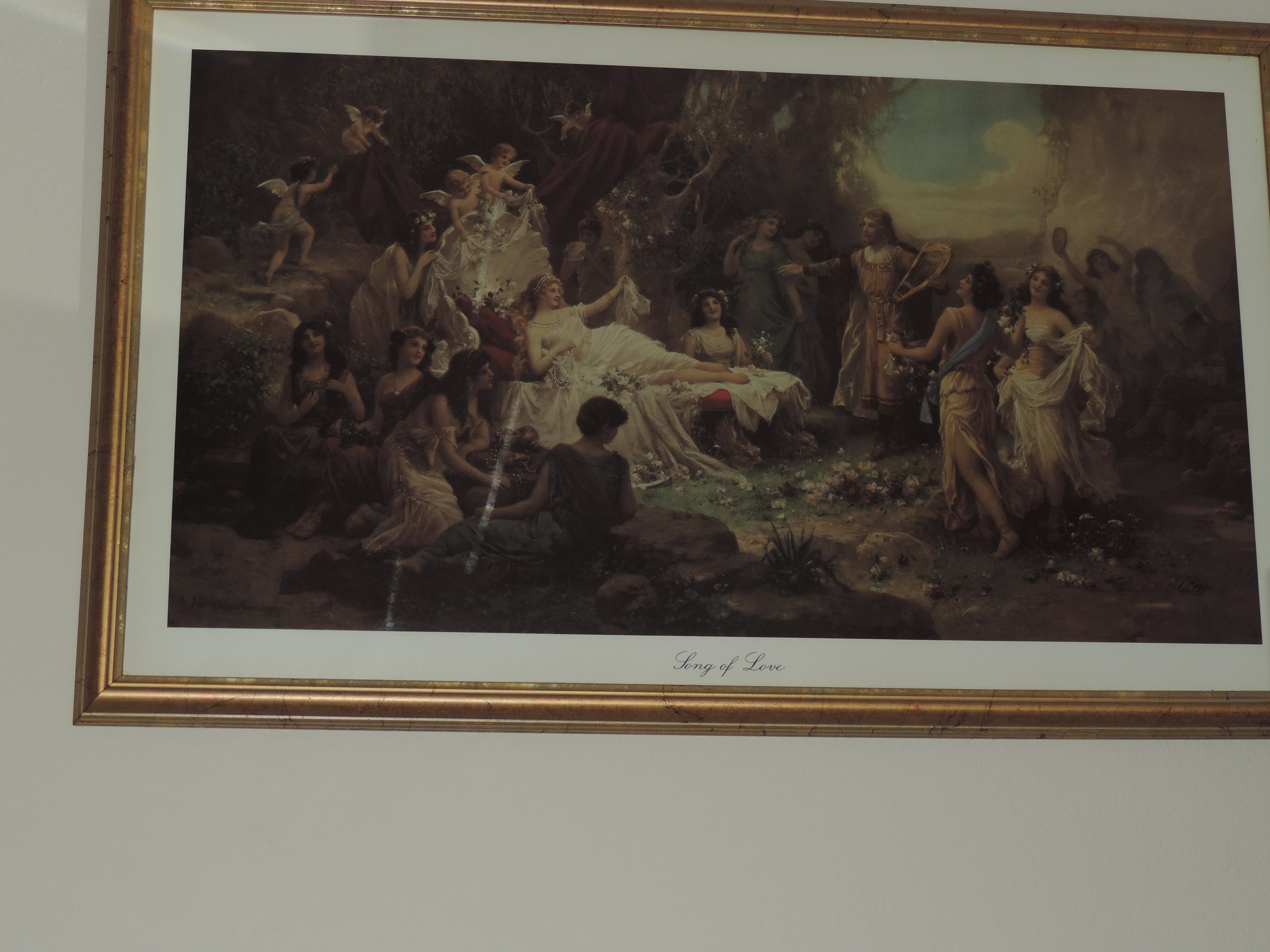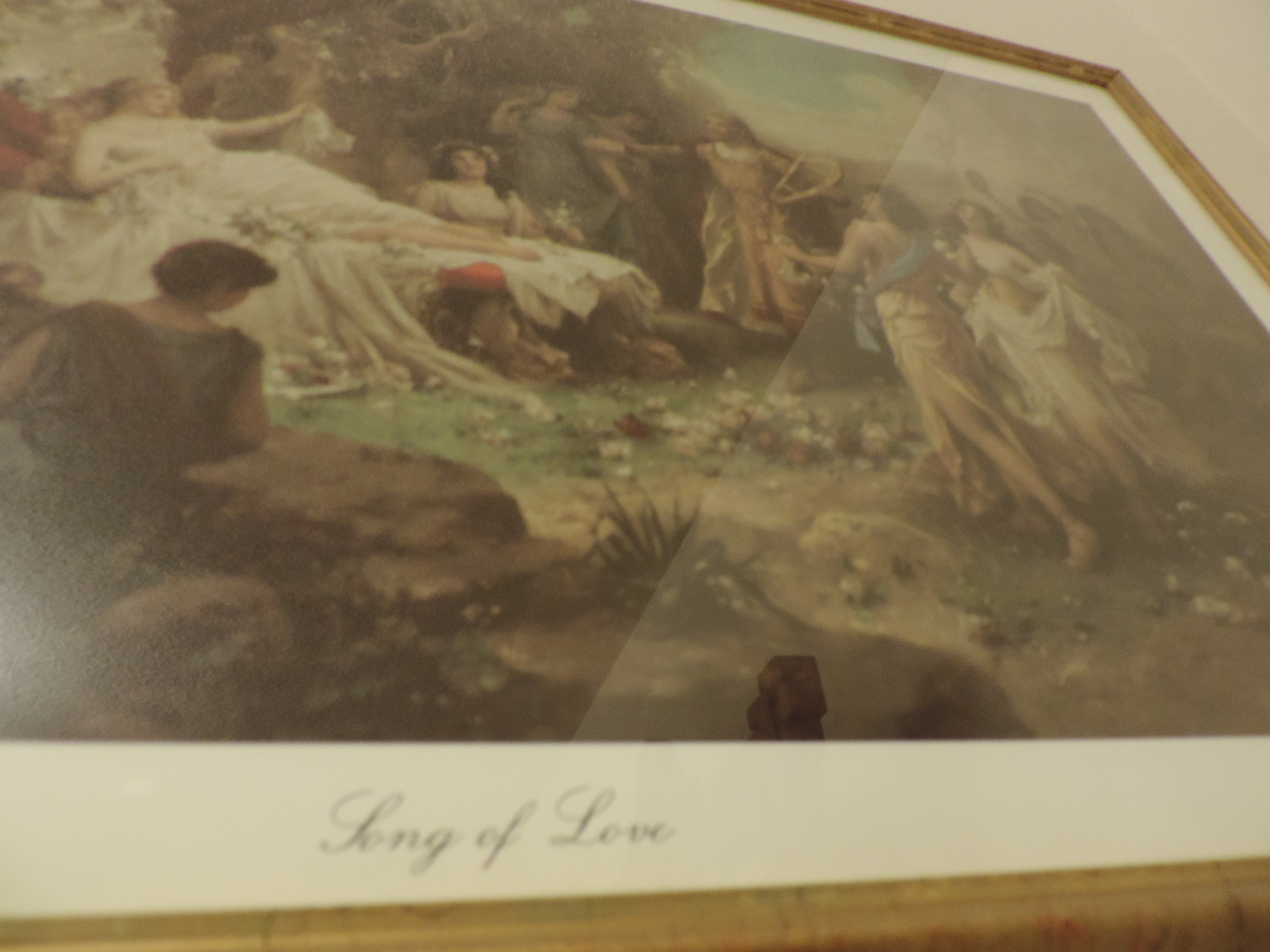 This is a framed artwork titled Song of Love. It has cheribs child like angels maybe considered Cupids around what may be a bride with her brides maids. I cannot find one like it anywhere when I have searched many ways. Song of Love always comes up with different pictues and I have no idea the artist on this either. It measure 35" x 21 1/2" in a gilded gold frame and glass over artwork