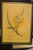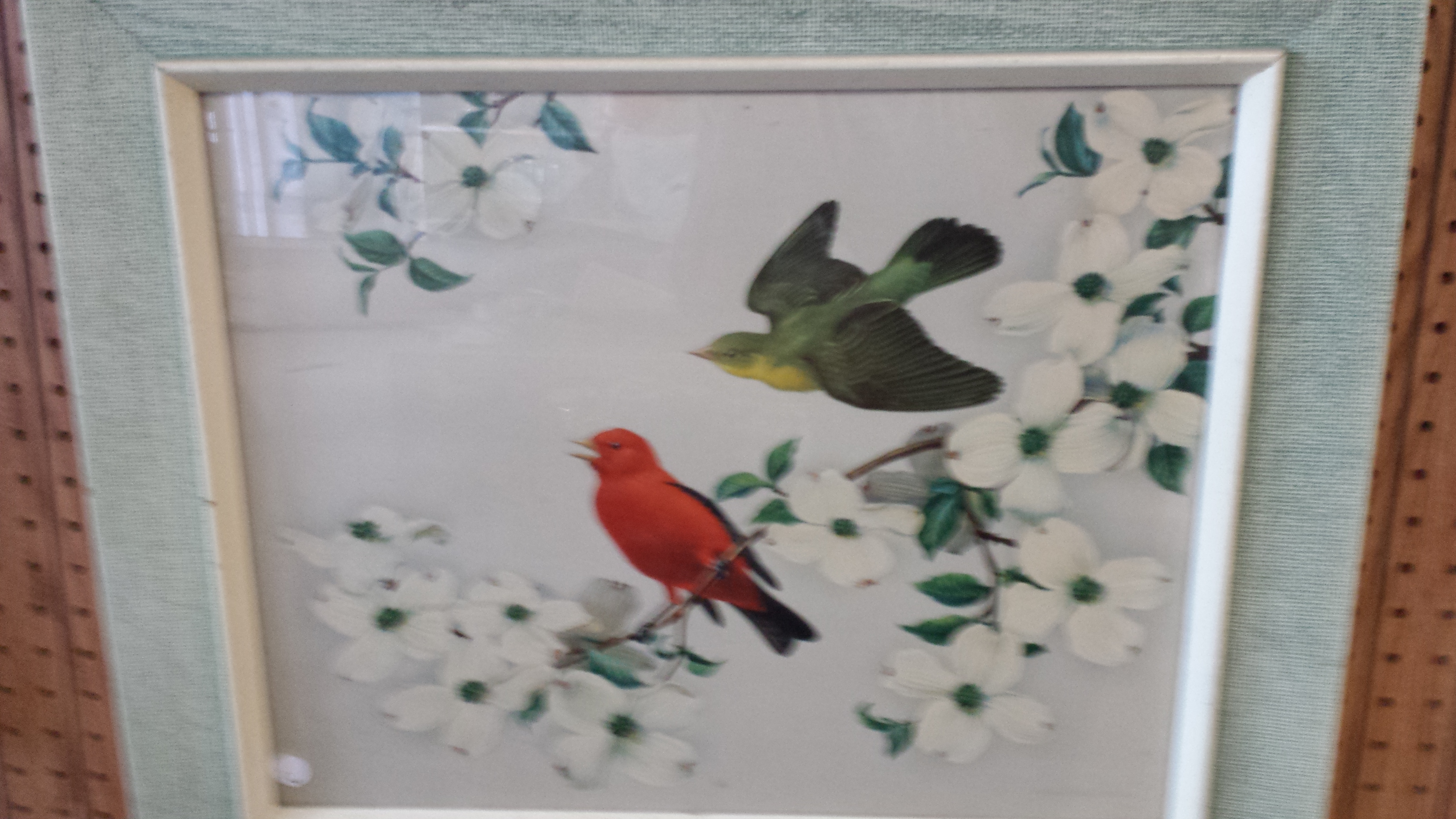 Bird and botanical print. James Irving botanical print. Dogwood tree in bloom with two birds in which one is in flight. One bird is red and the one in flight is green.