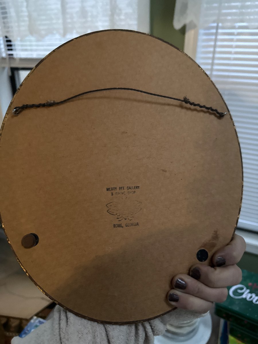 The artwork is framed by Merry Bee Gallery, a known frame shop located in Rome, Georgia. This gallery specializes in custom framing and has been in operation for several decades, catering to local artists and crafters. Their work is appreciated for its quality and craftsmanship, making it collectible among local art enthusiasts.