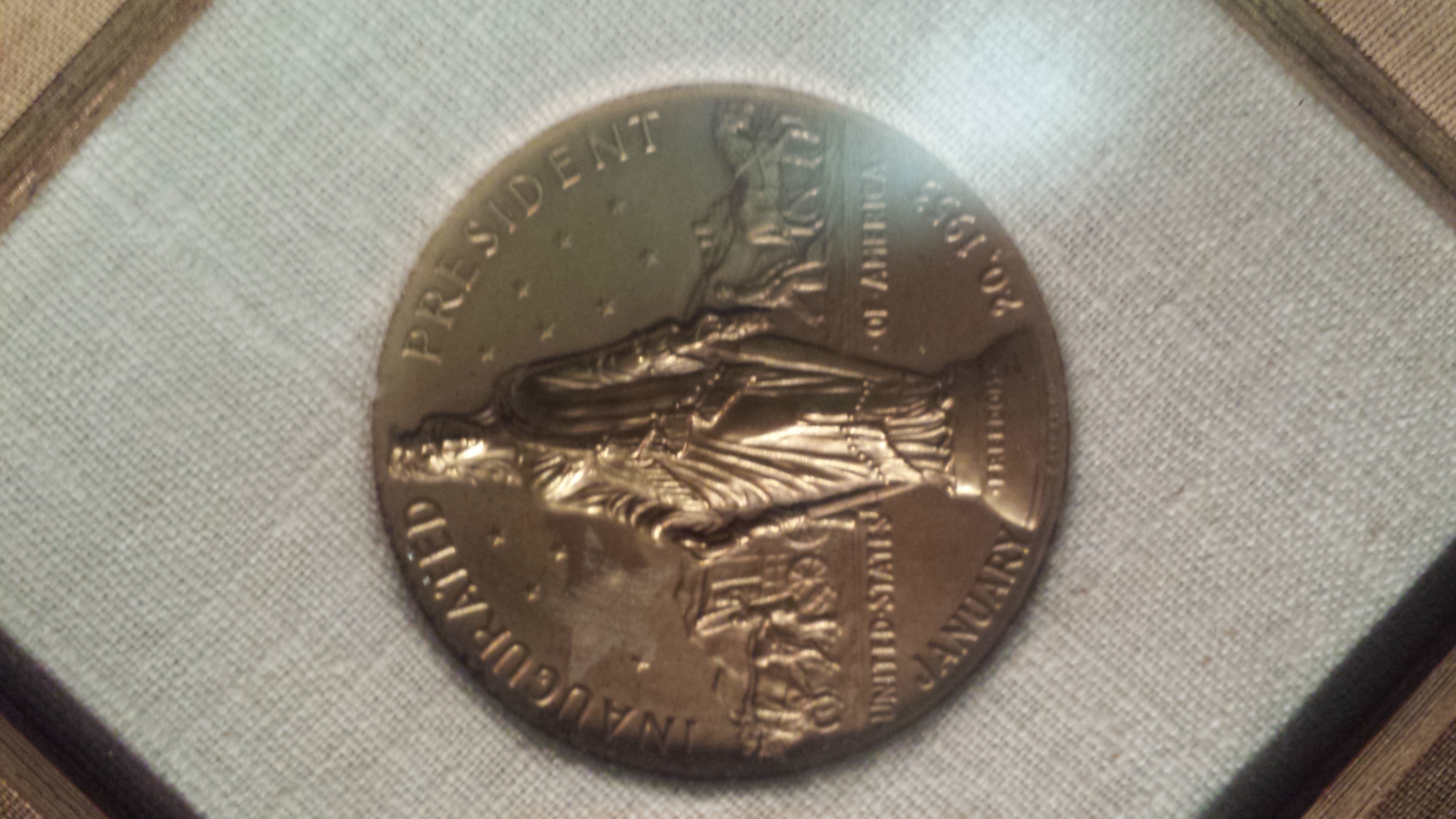 I have these two framed oversized coins of Dwight D. Eisenhower. They are both in the same type of frame. Framed by Mickelson's 709 G St., N.W. Washington, D.C. ( This picture frame contains the new revolutionary glass NON-REFLECTIVE GLASS the newest thing to perfection "Invisisble Glass" This is true glass and can be washed and handled in the normal manner ). The coin desing seem to be from two different people one looks to be J. Roberts 1954 the other Inaugurated President January 20, 1953 i cant make out i DO NOT WANT TO DE-FRAME THESES COINS. Im looking for a serious Dwight fan or mabye a coin collector to own these.
