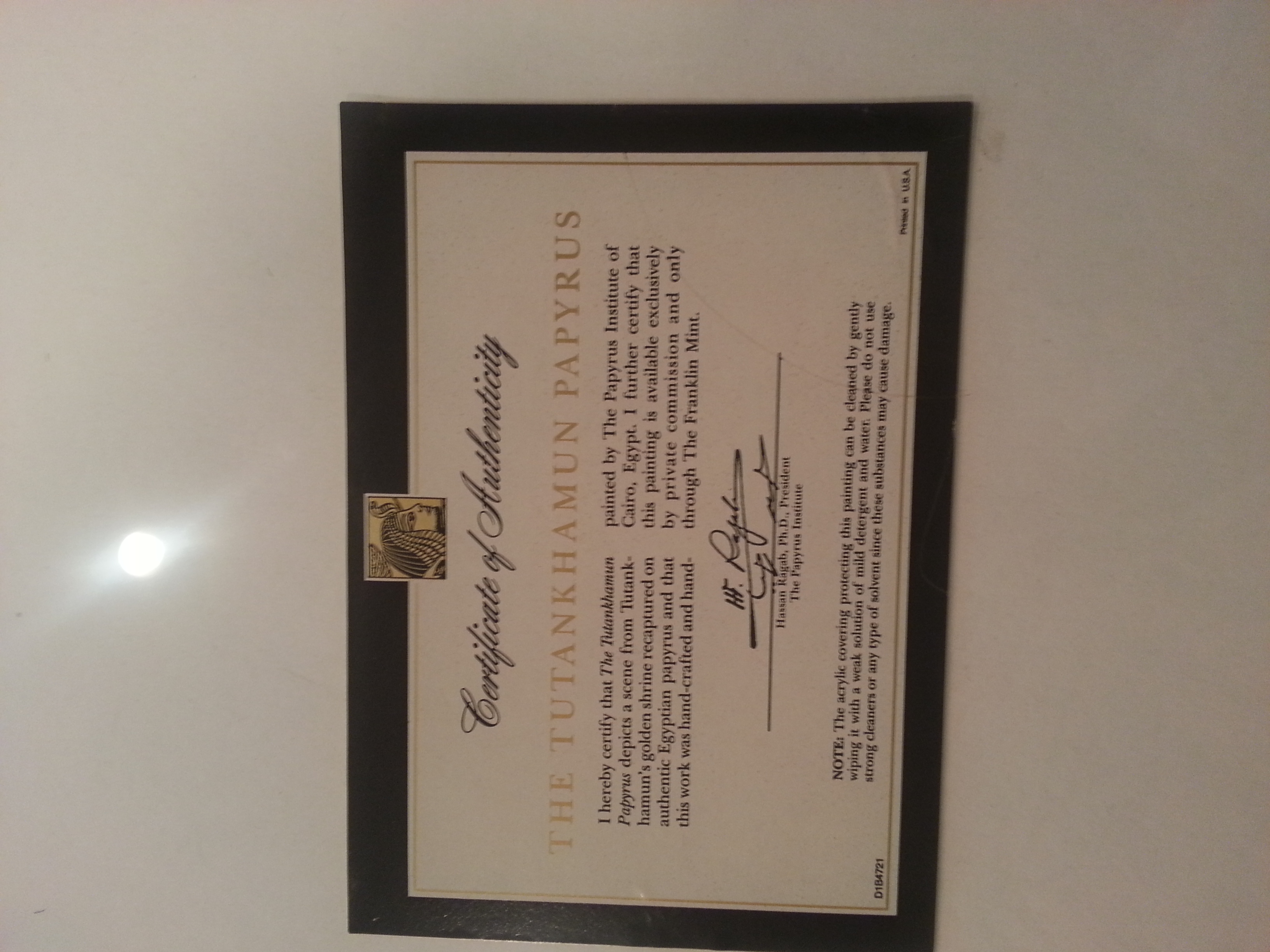 hello my name is Robert, let me start off by saying i do not know anything about paintings so please take it easy on me. i bought these two painting at an estate sale. both of these painting have a certificate of authenticity. On the certificate has the signature of Hassan Ragab, the President of The Papyrus Insitute. on the certification says the work was hand-crafted and hand-painted by The Papyrus Institute Of Cairo, Egypt. Now I've seen one of these exact paintings with the same frame online for 500.00 and claims it is painted with 24 carat gold (Which I really doubt that). I hope you people can help me out with this one. Both painting's are 24" by 31" with the frame. if you have any question please let me know. thank you.