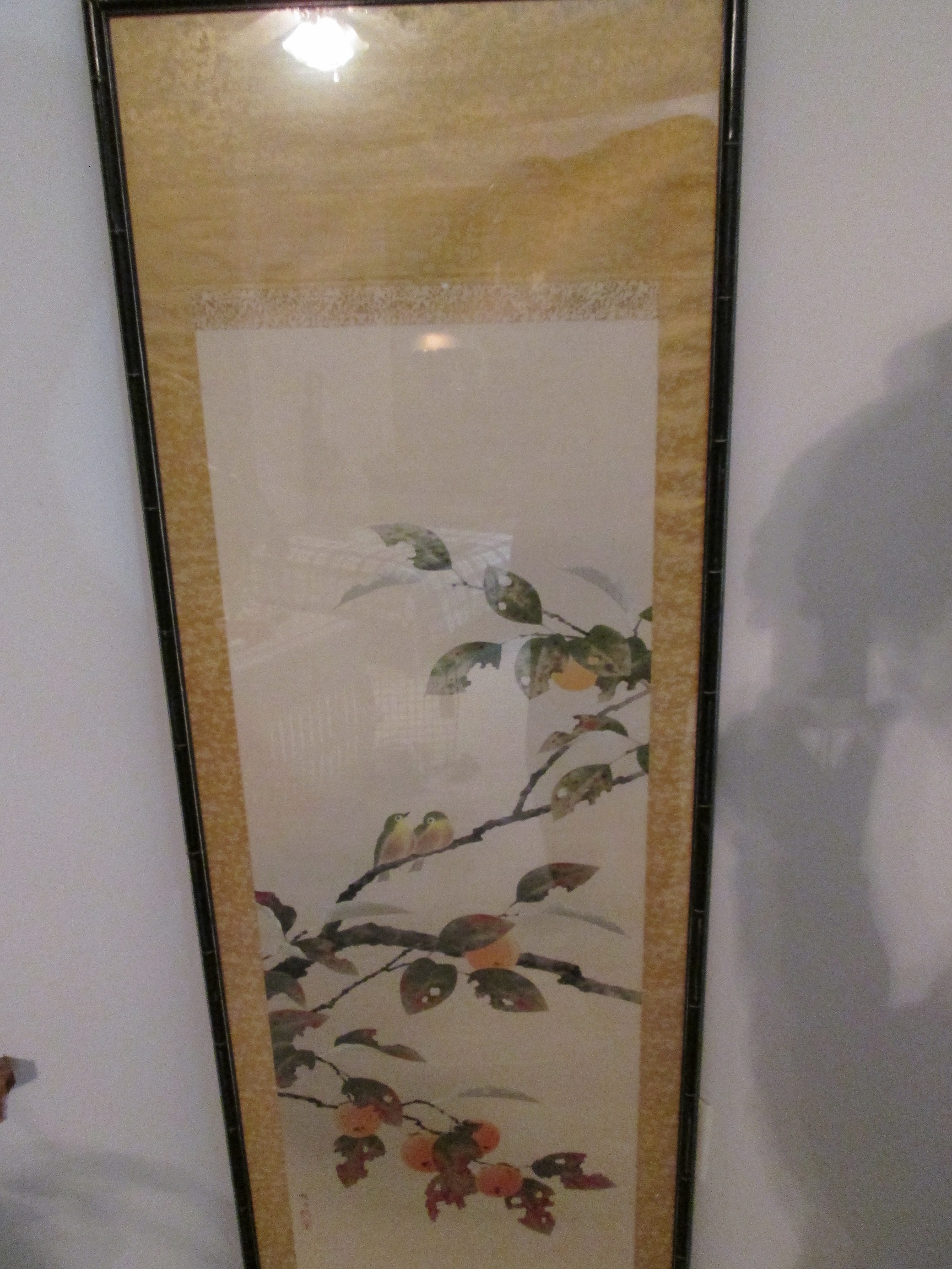 This scroll print has been put in a nice frame..It is a tall print and is signed..I do not know if its Japanese or Chinese.Very good condition!