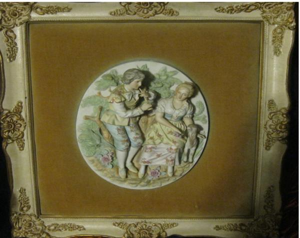 The figurine pertrudes from the frame about 2 inches. The figurine is pressed into a yellowish velet cushion background. The figurine looks French or European to me. I got it when my grandmother passed. The nails in the back are rusted so I would think it was very old also. As you can see in the picture the man on the figurine is playing an instrument of some sort and the lady is holding a baby lamb/sheep. The piece is in great condition also. No chips as far as I can tell and no cracks. Any help is appreciated. Thanks