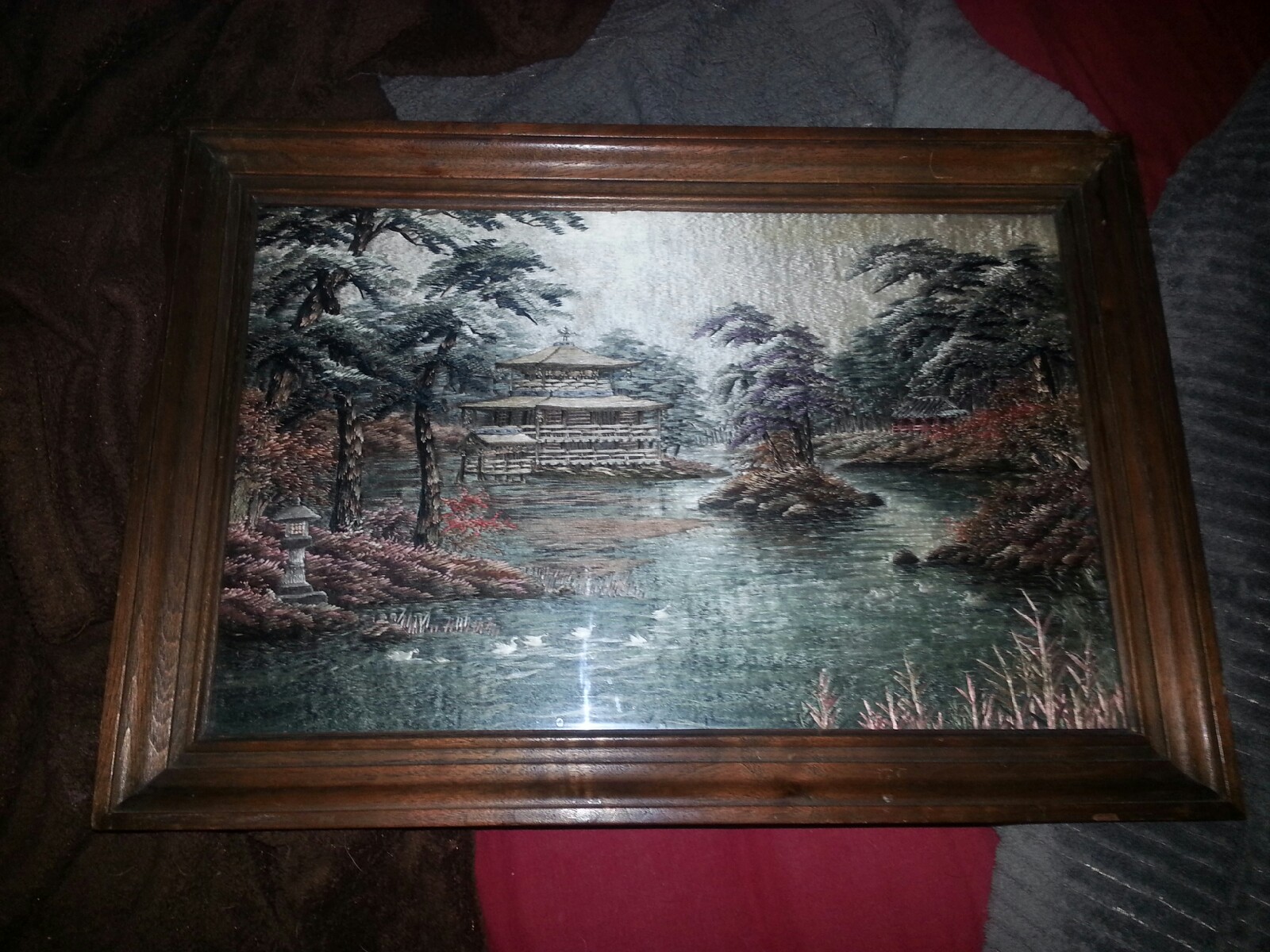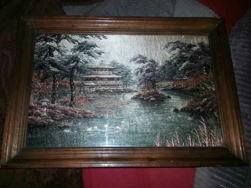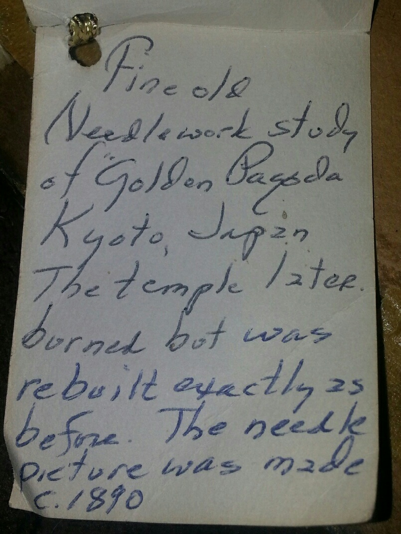 This framed needlework was found in a seized storage unit. It is absolutely gorgeous. There is a tag, containing a description, attached to the back of it from an Antique shop. I tried to contact the Antique shop but they are no longer in business. Frame included it measures about 18"x12". The colors have held up very well if it is as old as the tag says. There are no flaws or defects in the actual embroidery that I can see. It looks like silk but I'm not sure.